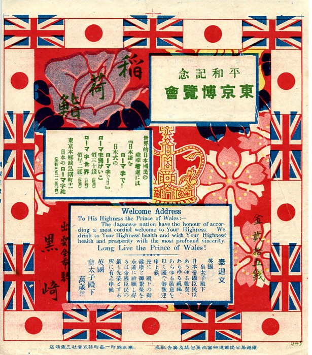 1922(大正11)年の調製と思われる、昔の出雲今市駅、現在の出雲市駅の駅弁の掛紙。同年に上野公園で開催された平和記念東京博覧会で英国の皇太子殿下が来日されたことを記念して、全国各地の駅弁屋が同じデザインの記念掛紙を使用したもの。周囲に日本と英国の国旗を配し、右に駅弁の名前、左下に調製元、下部に日英の歓迎文、上部の2枠は広告枠。