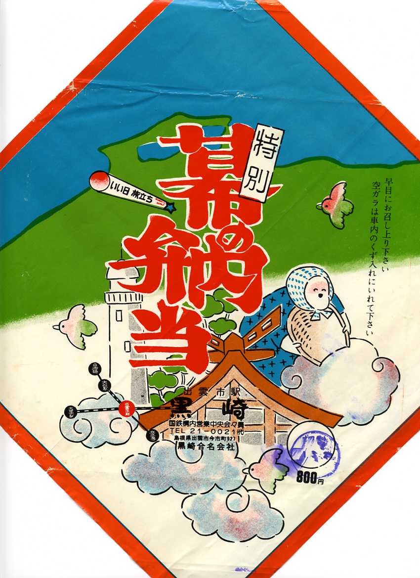 1980年代のものと思われる、昔の出雲市駅弁の掛紙。特製でなく「特別」と名乗るのは珍しいが、個人的には「高級分譲マンション」などと同じく、たいしたことがないと判断できると思うフレーズ。絵柄は、出雲大社、出雲日御碕灯台、安来節どじょうすくいを描き、宍道湖を除くこの地の名物名所を網羅する。