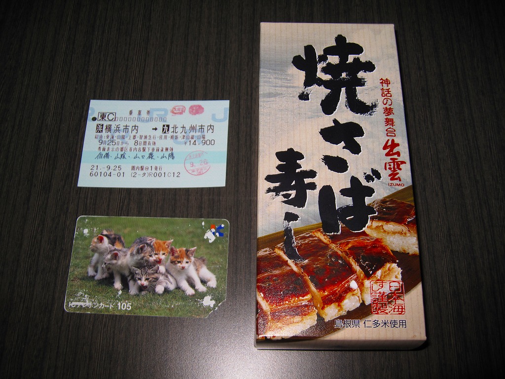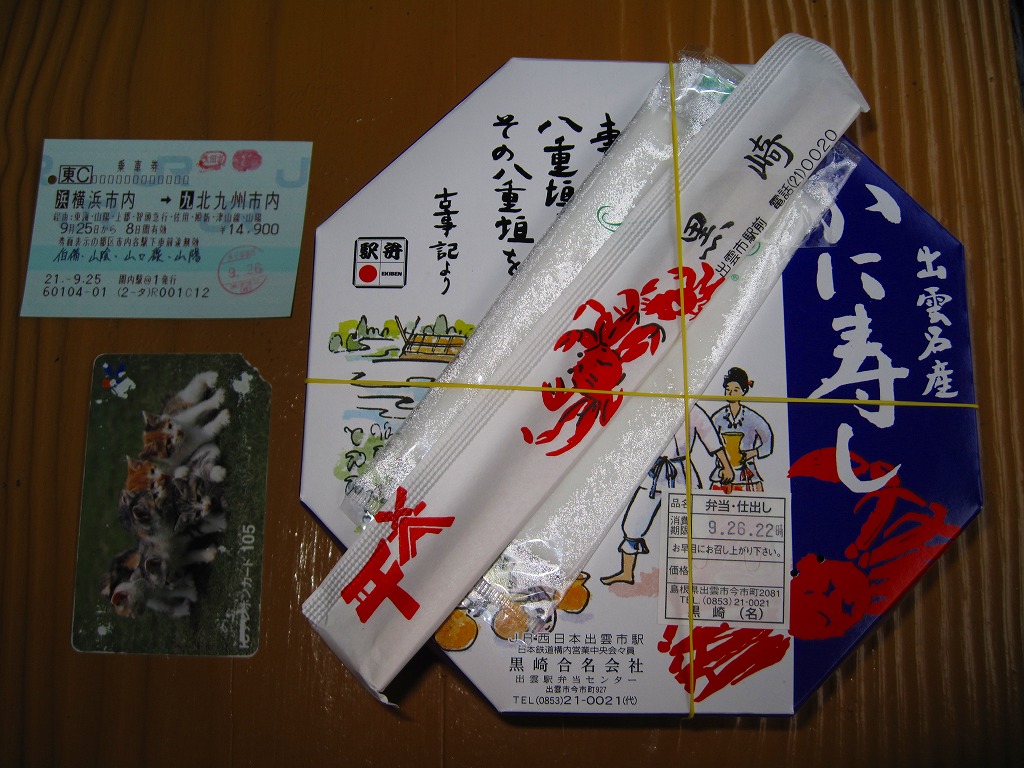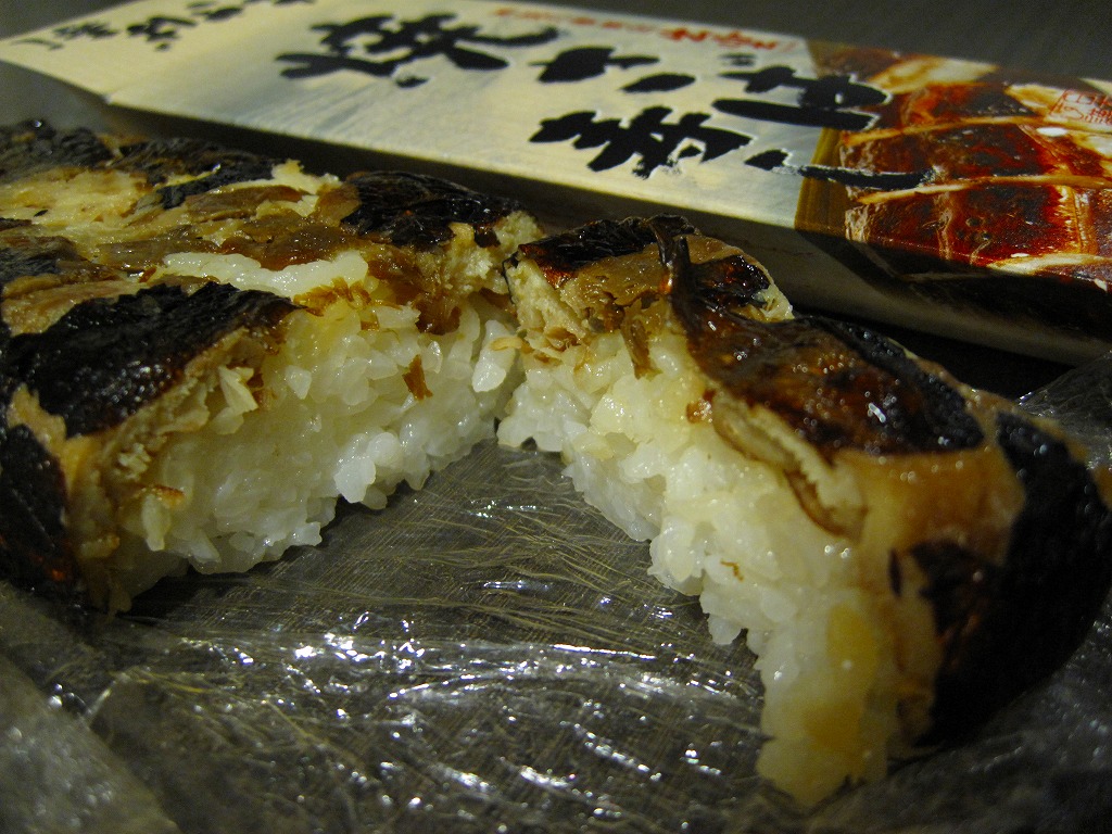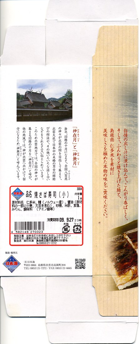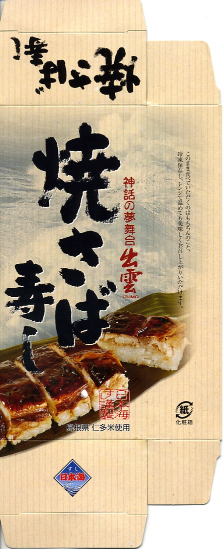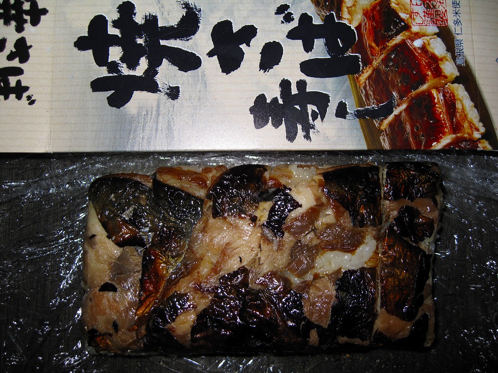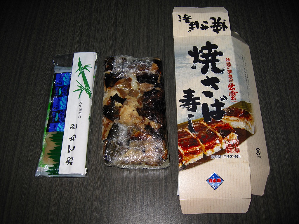 2003年秋の空弁ブーム以来、全国どこでも買える感のある焼きサバ寿司。出雲市駅で買えたものは御飯に島根県仁多米を使用、ノルウェー産と書いてあるサバの身は酢飯の上でぐちゃぐちゃになっており、見栄えは悪いが個性的である。味は特に変わりなし。なお、調製元は出雲市駅の駅弁屋ではない。駅弁屋が食堂ごと撤退したため、これも駅では2018(平成30)年9月に終売と思われる。