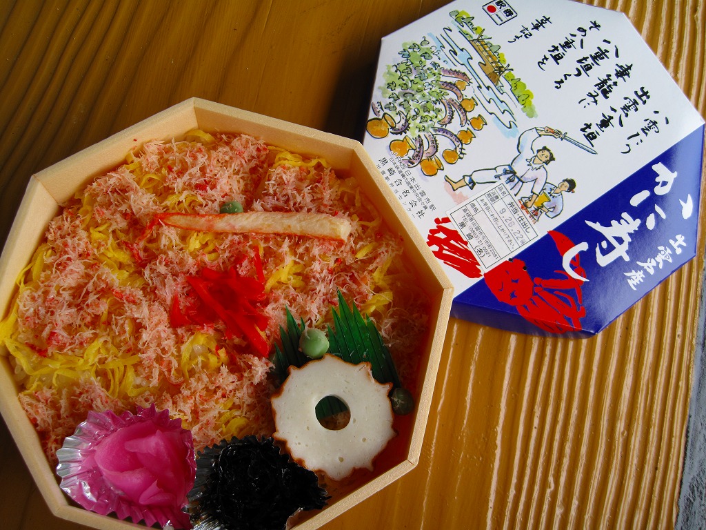 昭和40年代までには発売。正八角形の容器に、古代人や大社などを描いたボール紙のふたをして、輪ゴム2本で十字に留める。中身は酢飯の上にカニのほぐし身と錦糸卵を敷き詰め、カマボコやグリーンピースなどを添えるもの。かつて山陰本線の主要駅に軒並み備わっていたカニ駅弁のひとつであり、しかし好評も不評もあまり聞かない地味な存在である。価格は2009年の購入時で920円、2015年時点で940円。駅弁屋が食堂ごと撤退し、2018(平成30)年9月に終売。