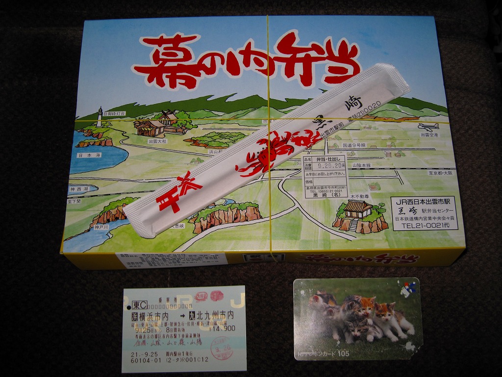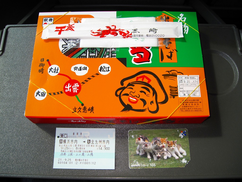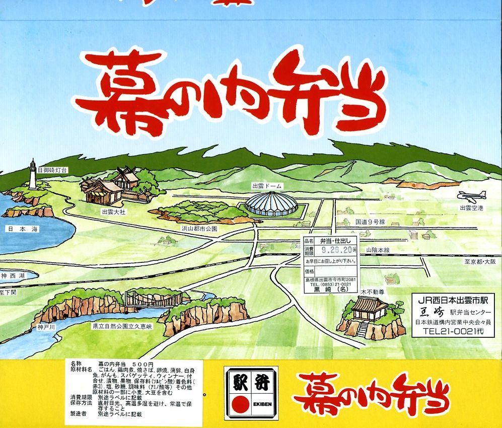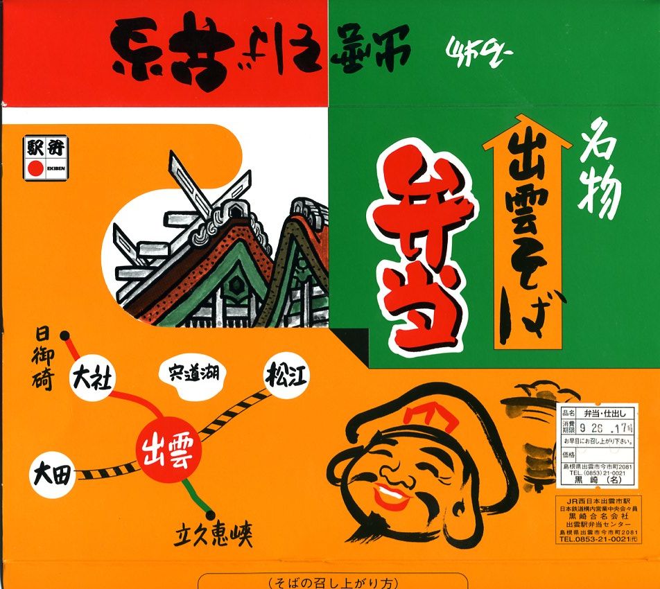 岡山駅から特急列車で約3時間。出雲市は島根県の東部で日本海に面した、人口約17万人の商工業都市。2000年かそれ以上前の神話の時代からの伝承や寺社が今に残る古代都市でもある。駅弁は駅構内に食堂を構える国鉄時代からの駅弁屋が販売したが、2018年9月限りで消えた。1910(明治43)年10月10日開業、島根県出雲市駅北町。