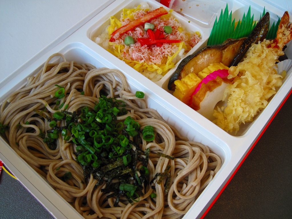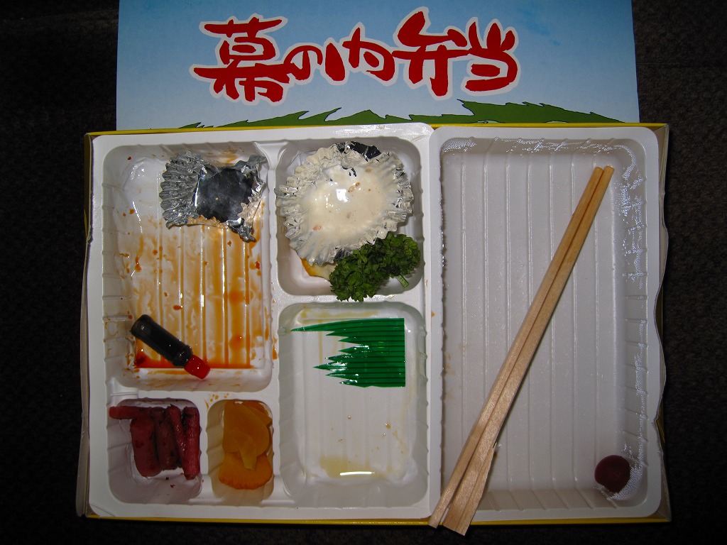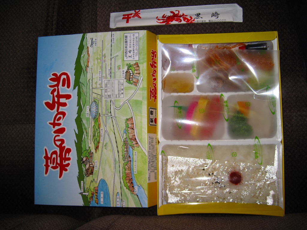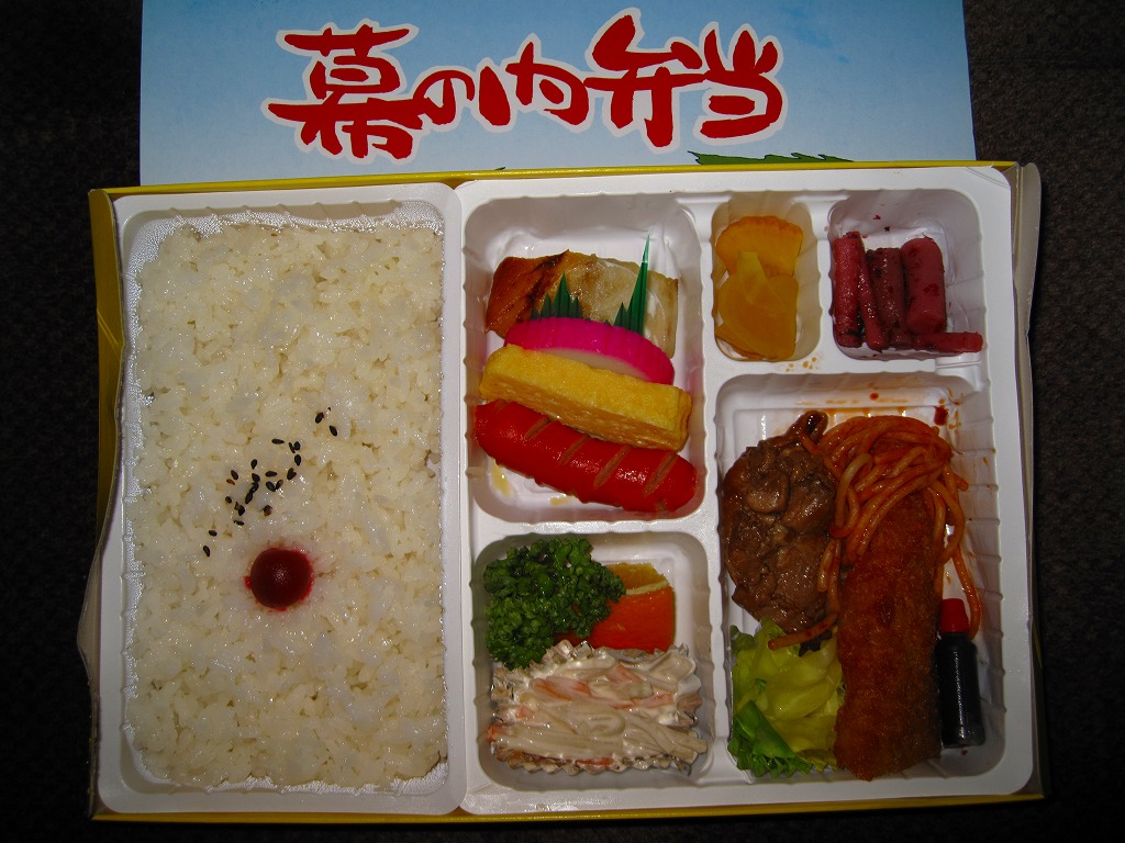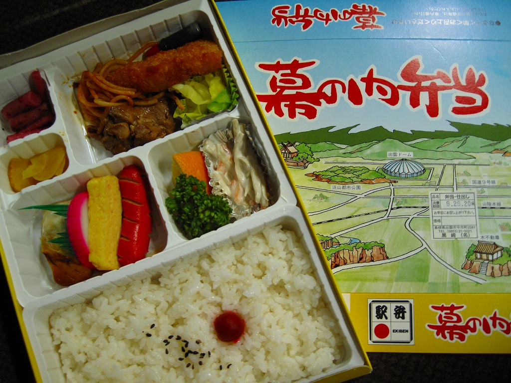 白く柔らかいプラ製トレーを2個詰めたボール紙製容器を使用、そのふたには駅を中心とした周辺の名所がイラストで描かれる。中身は日の丸御飯に鶏肉煮、白身魚フライ、焼サバ、ウインナー、玉子焼、カマボコ、スパゲティサラダ、オレンジなど。500円でこれだけ入っているのなら上出来だが、内容も品質も昭和の昔懐かしい幕の内駅弁で、駅弁ファン以外の心をつかめるかどうか。この駅弁は予約制とされるが、訪問時には売店で普通に買えた。駅弁屋が食堂ごと撤退し、2018(平成30)年9月に終売。