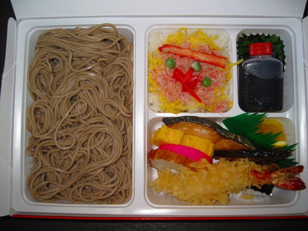 1960年代に「手打そば弁当」の名で発売か。簡単な路線図と出雲大社や商品名などを描いたボール紙製の専用容器を使用、中身は4割がそば、3割がおかずで海老天、焼マス、カマボコ、玉子焼、ワカサギ甘露煮など、2割がかにちらしずし、1割がめんつゆのボトルと刻みネギ。出雲の名物であるそばと、出雲駅弁の名物であるかにずしが同時にいただける。価格は2009年の購入時で1,050円、2014年4月の消費税率改定で1,080円。駅弁屋が食堂ごと撤退し、2018(平成30)年9月に終売。
