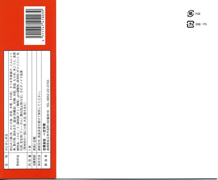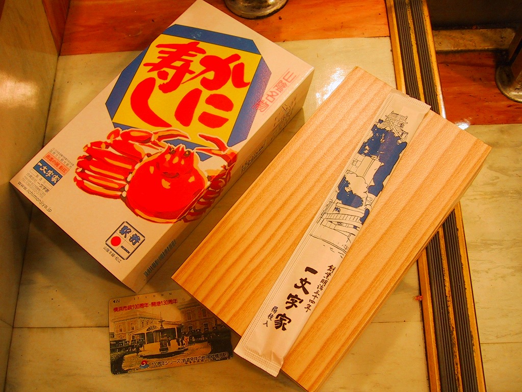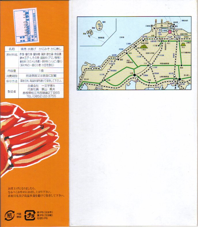 1970年代の調製と思われる、昔の松江駅弁の掛紙。300円の価格から、1972年頃のものか。商品名と調製元と赤いカニのみを描いた、分かりやすい絵柄。掛紙に記される「国際観光文化都市」とは、自称やキャッチフレーズではなく、1951年に公布された松江国際文化観光都市建設法に基づく法律用語であり、この名では全国で京都市と奈良市と松江市のみが使える。