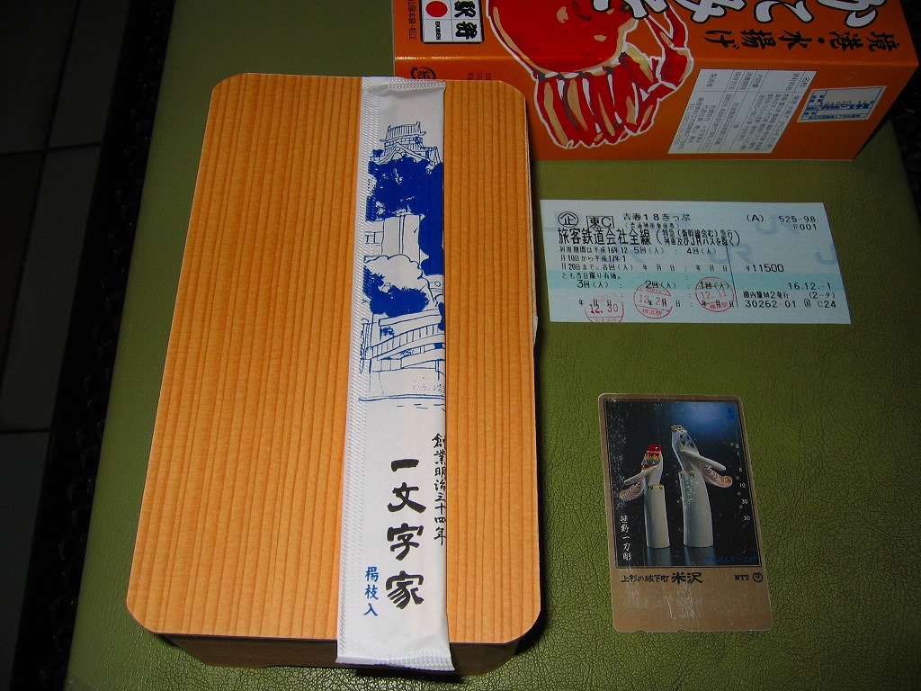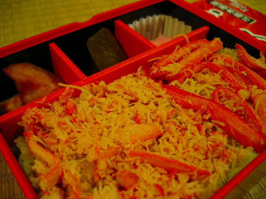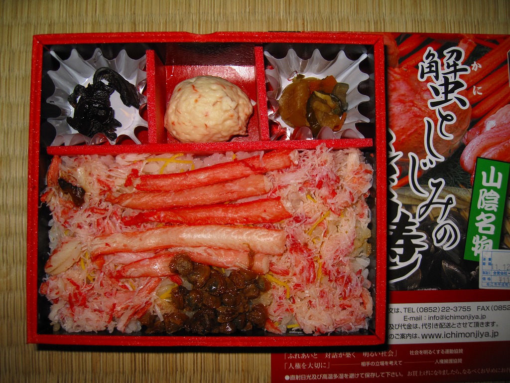 秋冬の駅弁大会シーズンに向けた、2007(平成19)年秋の新商品で、10月1日に発売。赤く小柄でフタがしっかり閉まる構造の容器を、やはりそれがぴったりと収まるボール紙の枠にはめる。その絵柄はカニで真っ赤っか。中身は赤貝入りの茶飯の上をカニのほぐし身と細めの脚肉で覆い隠して、やはり真っ赤っか。サツマイモ、こんにゃく、酢の物を添えてできあがり。食べて飯の内外に現れる赤貝の、カニと飯とのハーモニーはクセになる。2008年1月の京王百貨店の駅弁大会では入手困難の人気だったそうな。