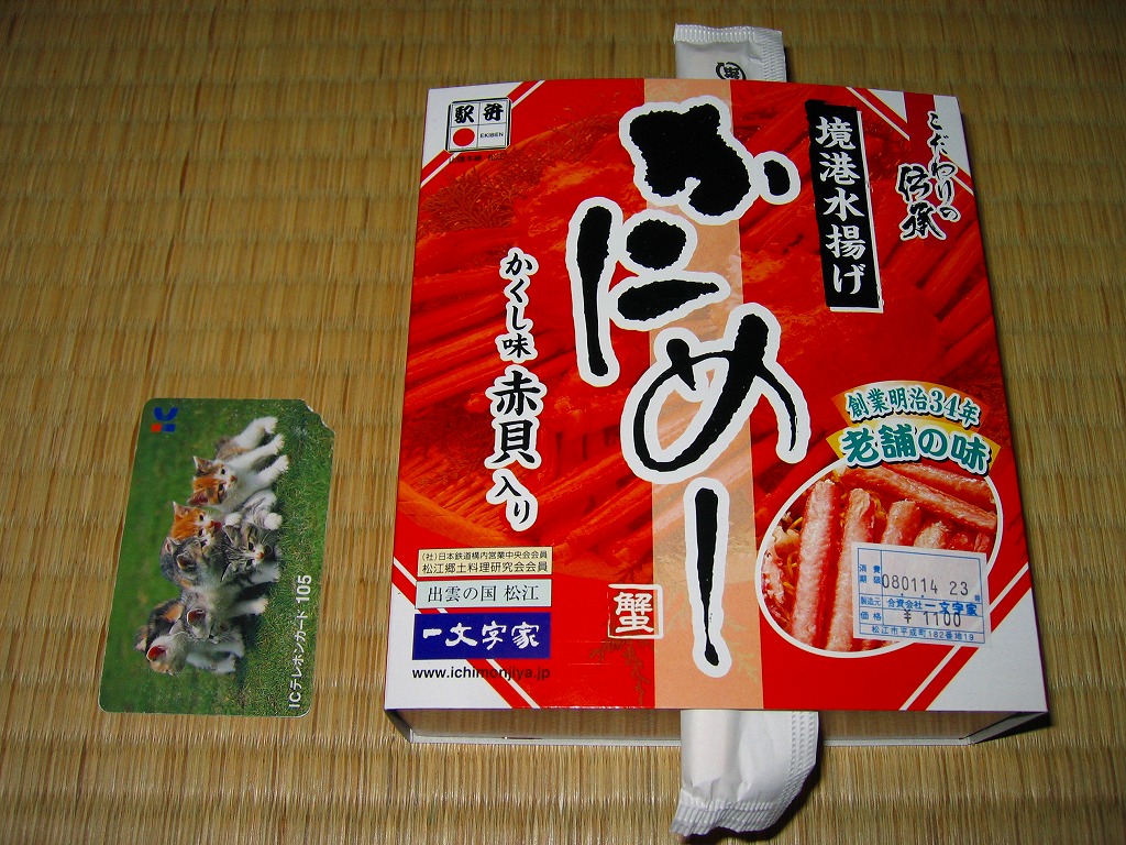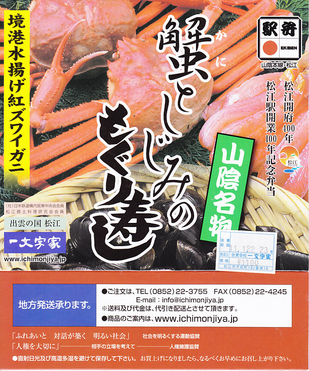 松江駅のカニ寿司駅弁。甘酢御飯の上にカニの足が、細身ながら10本前後敷かれる。カニ寿司駅弁は、特に駅弁大会向けに遠隔地へ輸送する場合、酢漬けにされてしまうことが多いが、この駅弁は東京都内の駅弁大会で購入したにもかかわらず飯やカニの味を感じられた。価格は2003年の購入時で950円、2008年7月22日から1,050円、2014年4月の消費税率改定で1,080円、2016年時点で1,100円、2018年時点で1,150円、2019年時点で1,200円、2020年時点で1,320円、2023年時点で1,500円、2024年時点で1,630円。