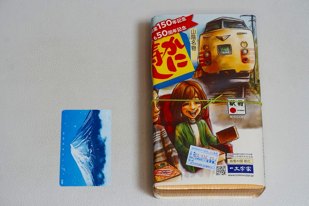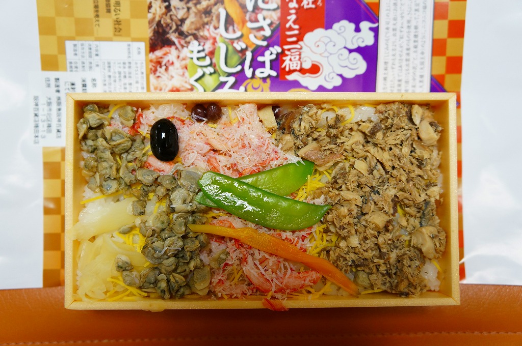 出雲大社の遷宮を記念して、2013(平成25)年1月の阪神百貨店の駅弁大会でデビューか。長方形の容器に酢飯を敷き、サバほぐし身、カニ酢漬けのほぐし身、シジミの時雨煮で覆い、生姜や黒豆やインゲンなどを添えるもの。駅弁として悪くない味だが、見た目の個性と見栄えのツヤがないため、満員の客で賑わう大都会の百貨店の催事場ではとても地味であり、実演販売ブースではずっと客待ちをしていた。価格は2013年の発売時や購入時で1,050円、2016年時点で1,060円。2018年頃か2020年までの販売か。