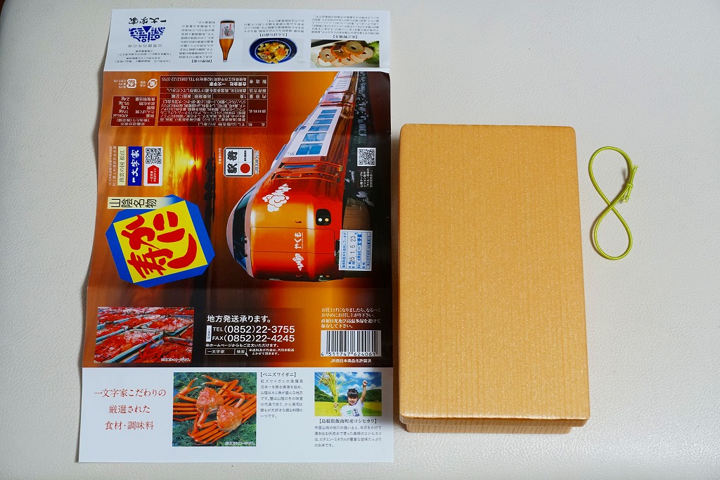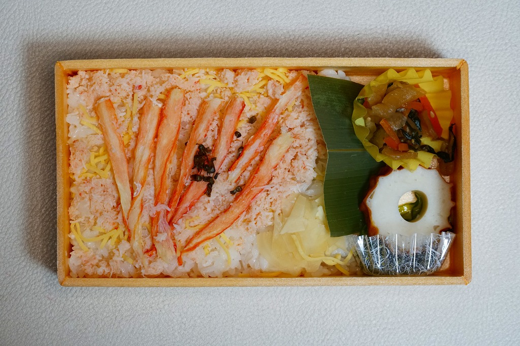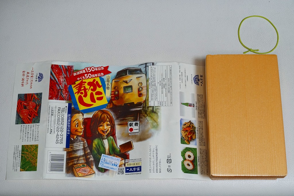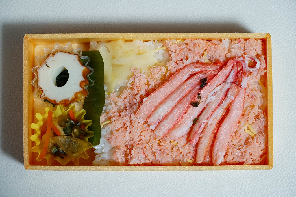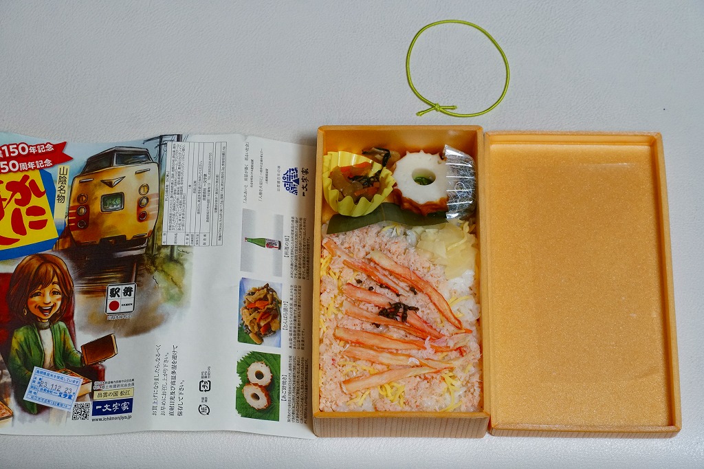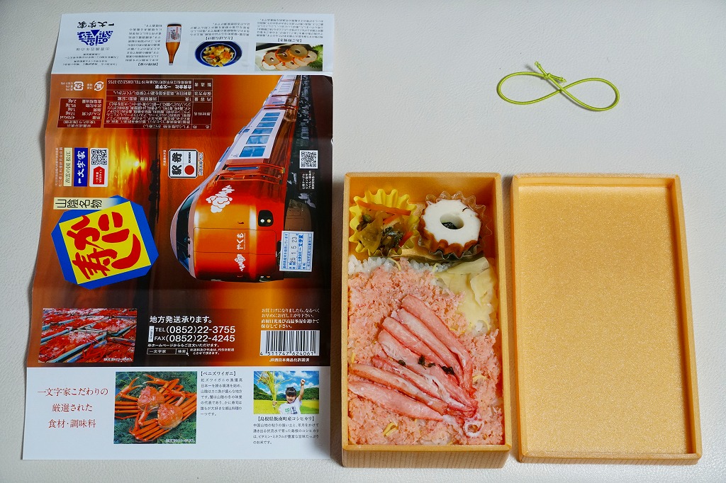 長方形の容器に、島根県産コシヒカリの酢飯を詰め、錦糸卵とカニそぼろで覆い、ベニズワイガニの棒身の酢漬けを並べ、しその実で彩り、ちくわ「あご野焼き」、とんばら漬け、わかめ佃煮、酢生姜を添える。掛紙には写真付きで食材の紹介があって分かりやすい。値段を気にしなければ、地元の名物も知られざる味も楽しめる、お食事向けに機能的なカニ駅弁だと思う。