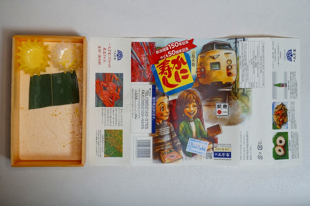 2022(令和4)年10月14日に松江駅で発売、3月31日まで販売の予定。日本鉄道構内営業中央会の鉄道開業150年記念復刻駅弁企画により、同月から期間限定で販売された31社34駅弁のひとつ。ここではさらに、特急やくも開通50周年も記念して、既存の駅弁「山陰名物かに寿し」をリニューアルした。レトロ調の水彩画タッチとされる掛紙には、特急やくもと車内と駅弁のイラストを描く。