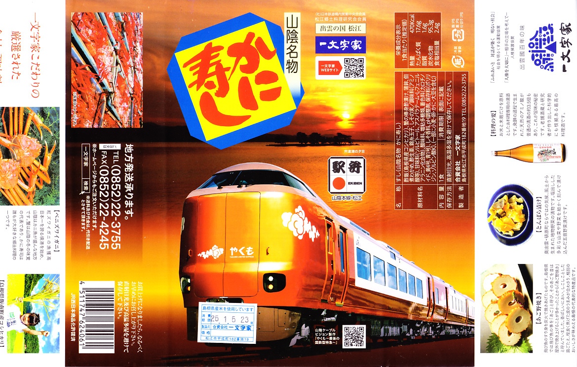 2024(令和6)年5月に松江駅などで発売。上記の駅弁「山陰名物かに寿し」について、 特急やくも号の新型車両登場を記念して、スリーブをそのCGイラストを用いた掛紙に替えて発売した。中身と価格は通常版と同じ。公式サイト上では通常版とこの版を併売しているように見えるが、この掛紙を使う間は通常版を売らないのではと思う。