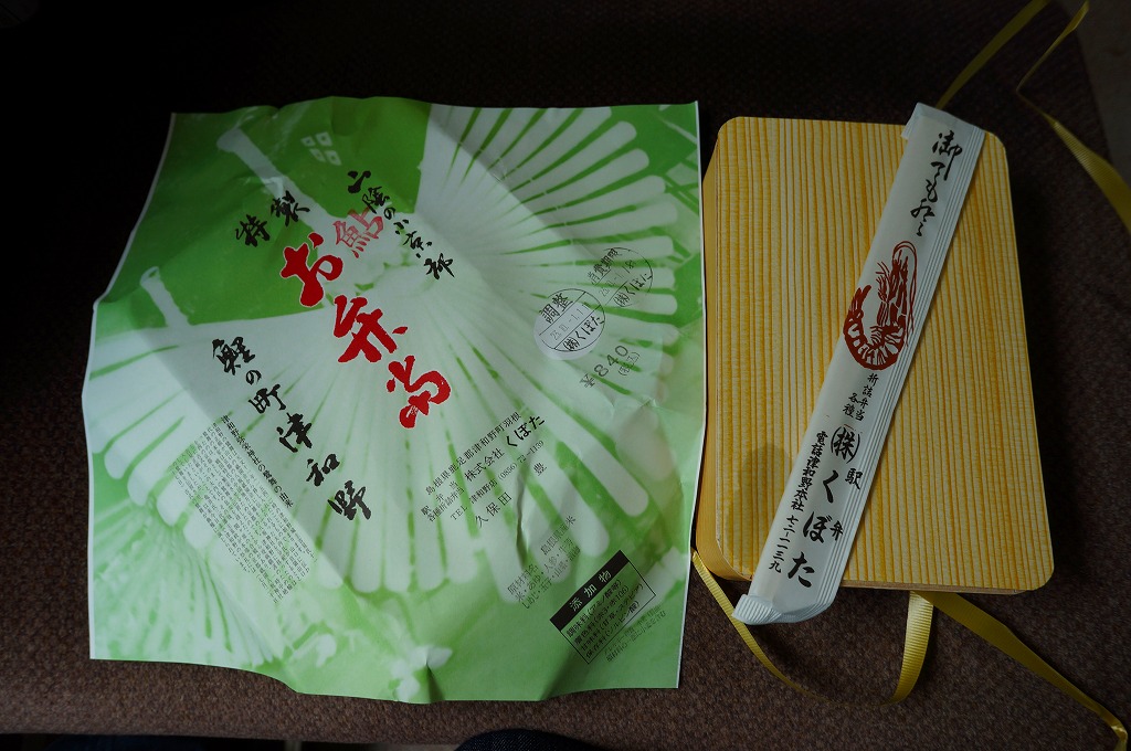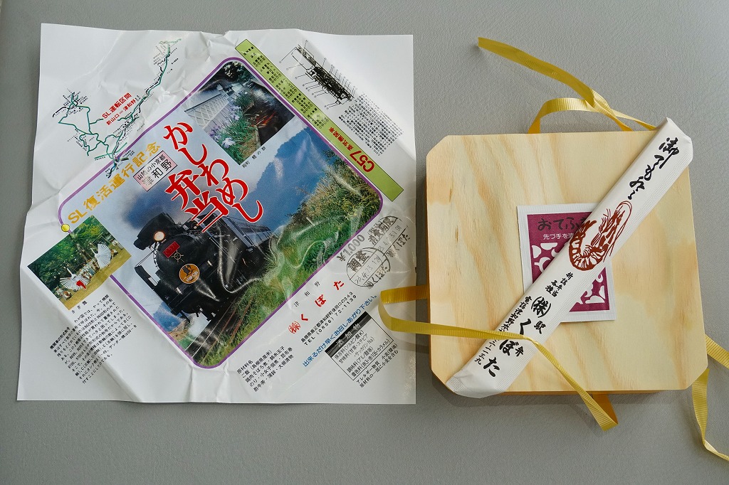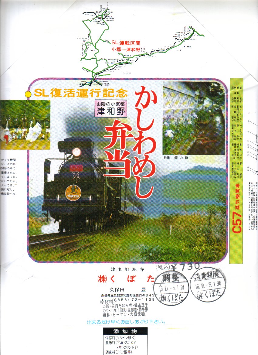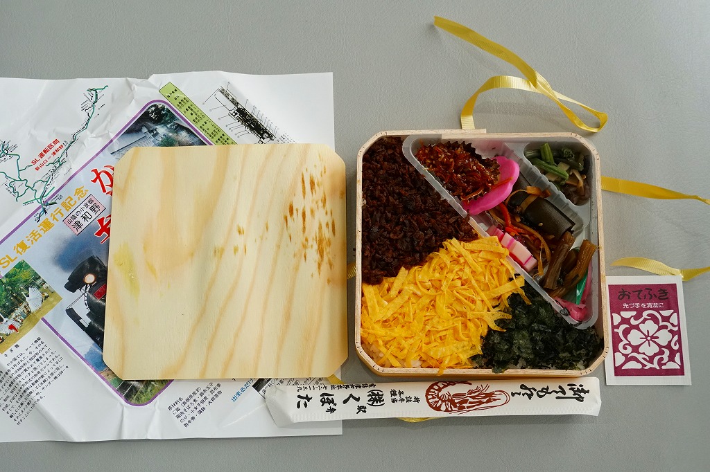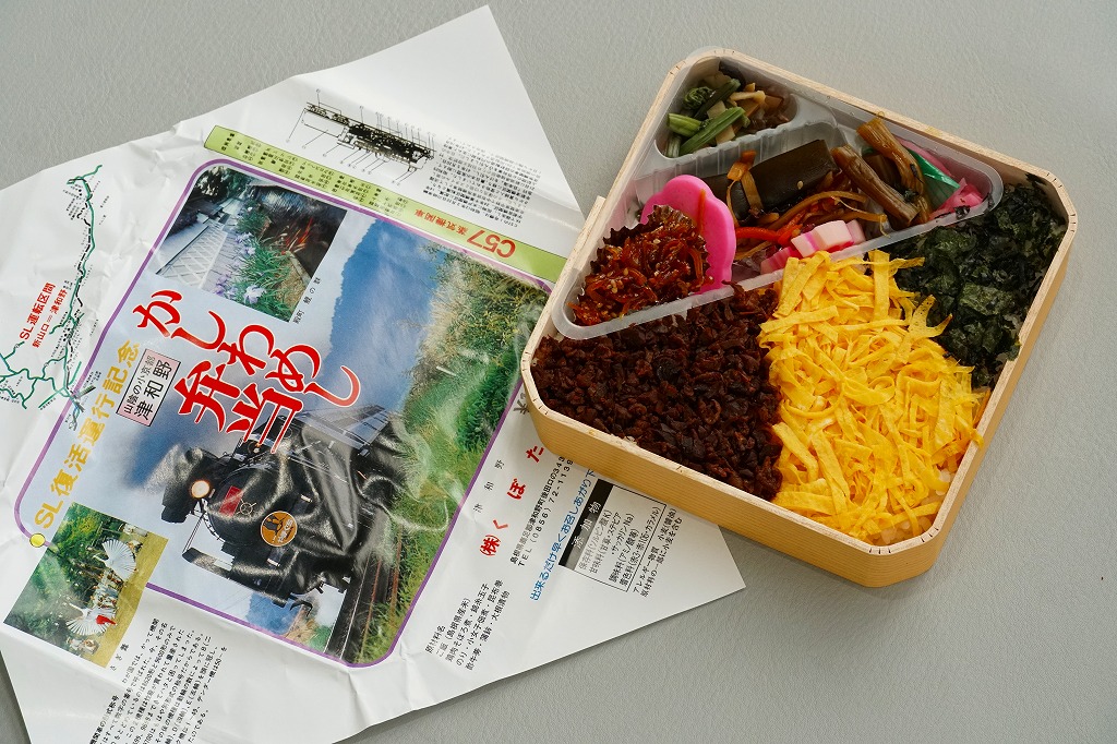 1960年代の発売か。他の津和野駅弁と同じく、経木枠の正方形の容器に経木のふたをして、正方形の掛紙をかけてビニールひもでしばる。その掛紙には「SL復活運行記念」の文字があり、マニアックに見ると蒸気機関車や客車の外観が現在と異なる運行開始時のスタイルなので、おそらく1979(昭和54)年8月当時の絵柄がそのまま使われていたのだろう。