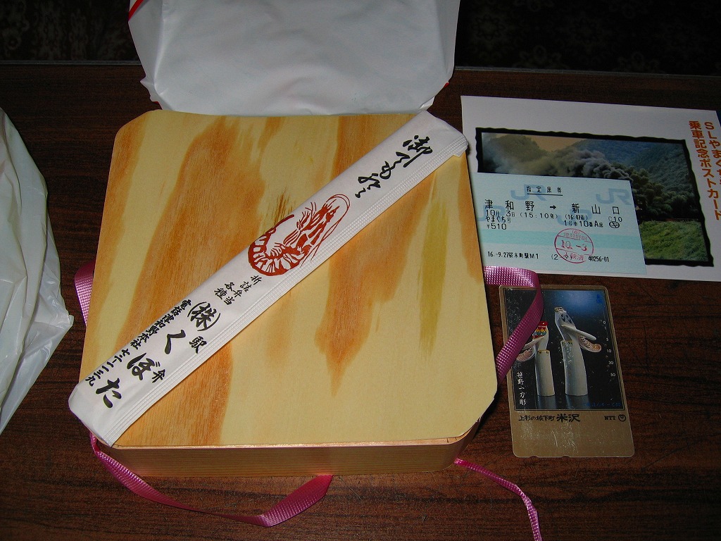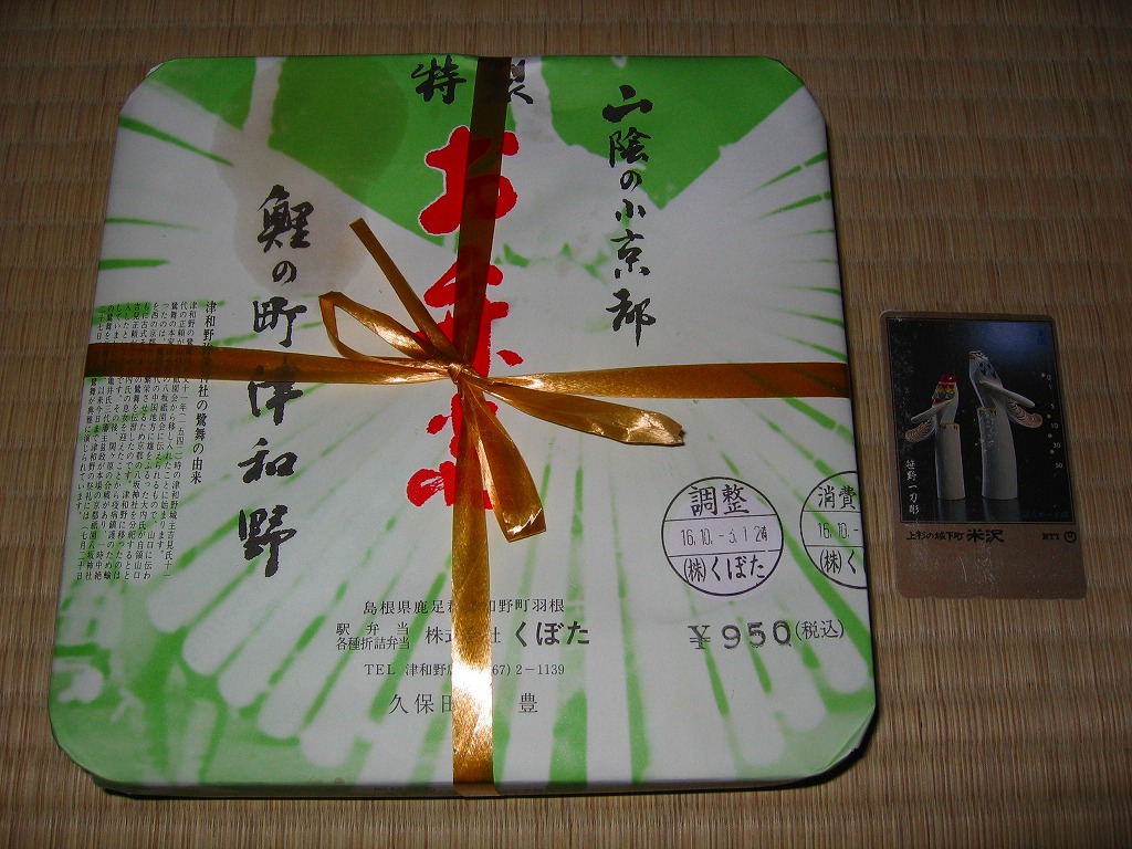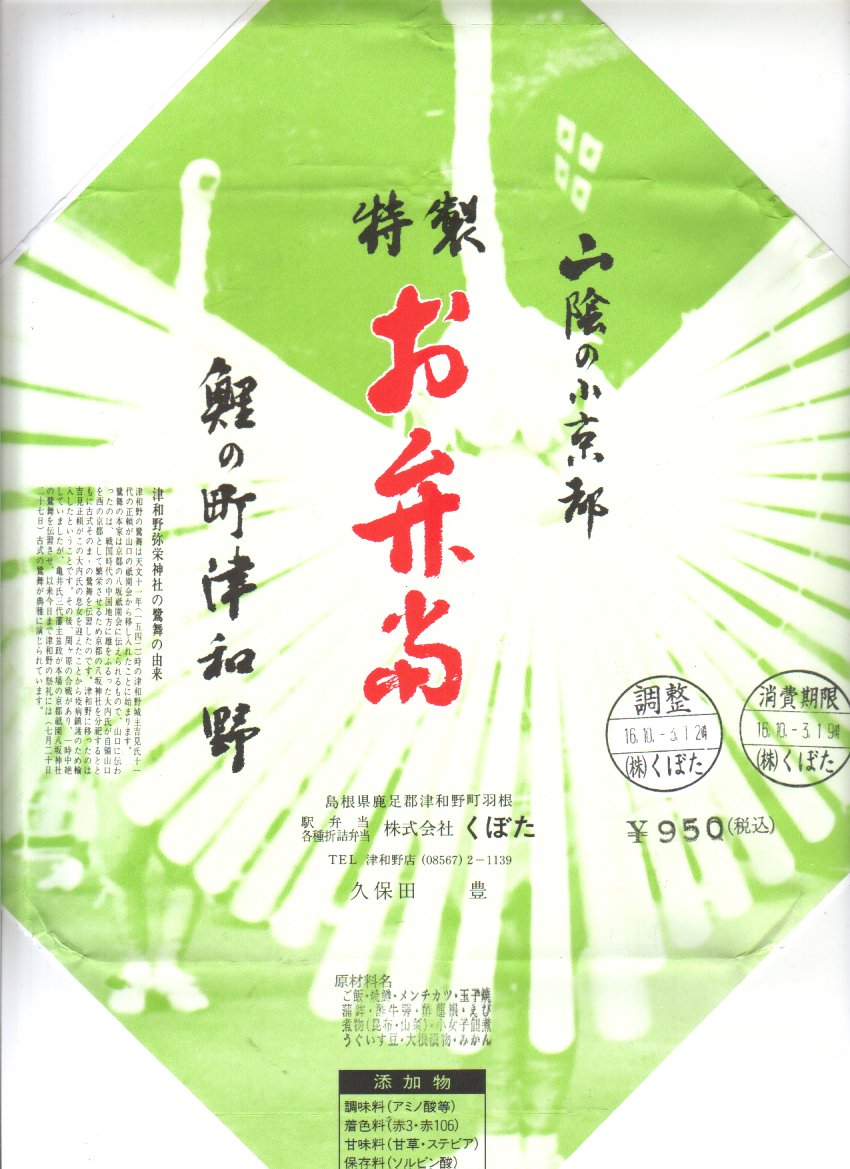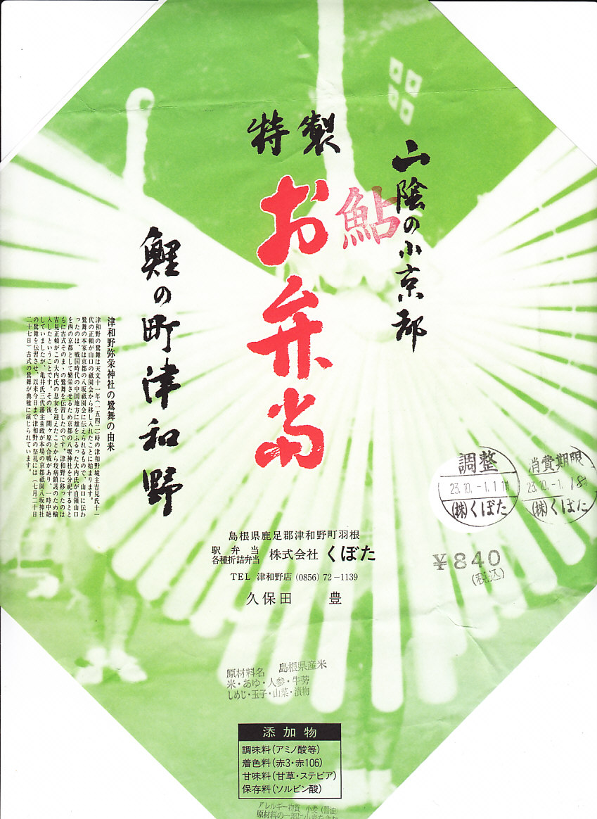 2004(平成16)年10月3日に購入した、津和野駅弁の掛紙。上記の2023年のものと、ほぼ変わらない。価格と「調整」と消費期限を捺印するところも変わらない。容器も中身も変わらない。津和野駅弁の売り場がなくなり、駅が改装され、駅員がいなくなり、駅弁はSL発着時にのみ売りに来るようになったのが変化。