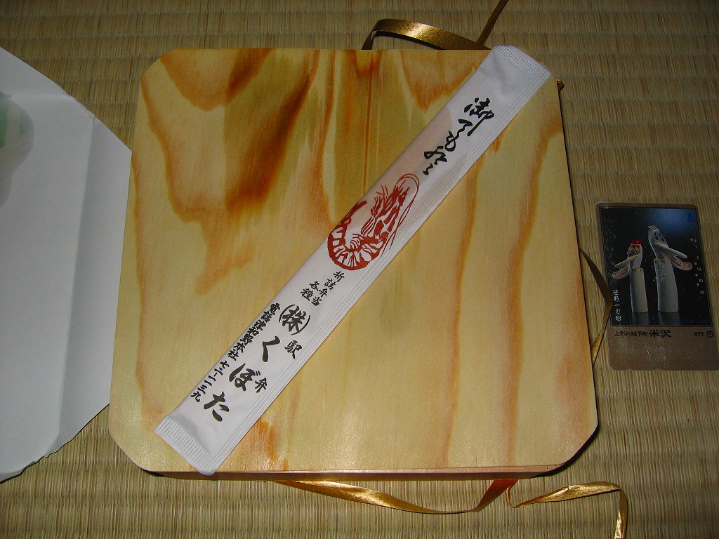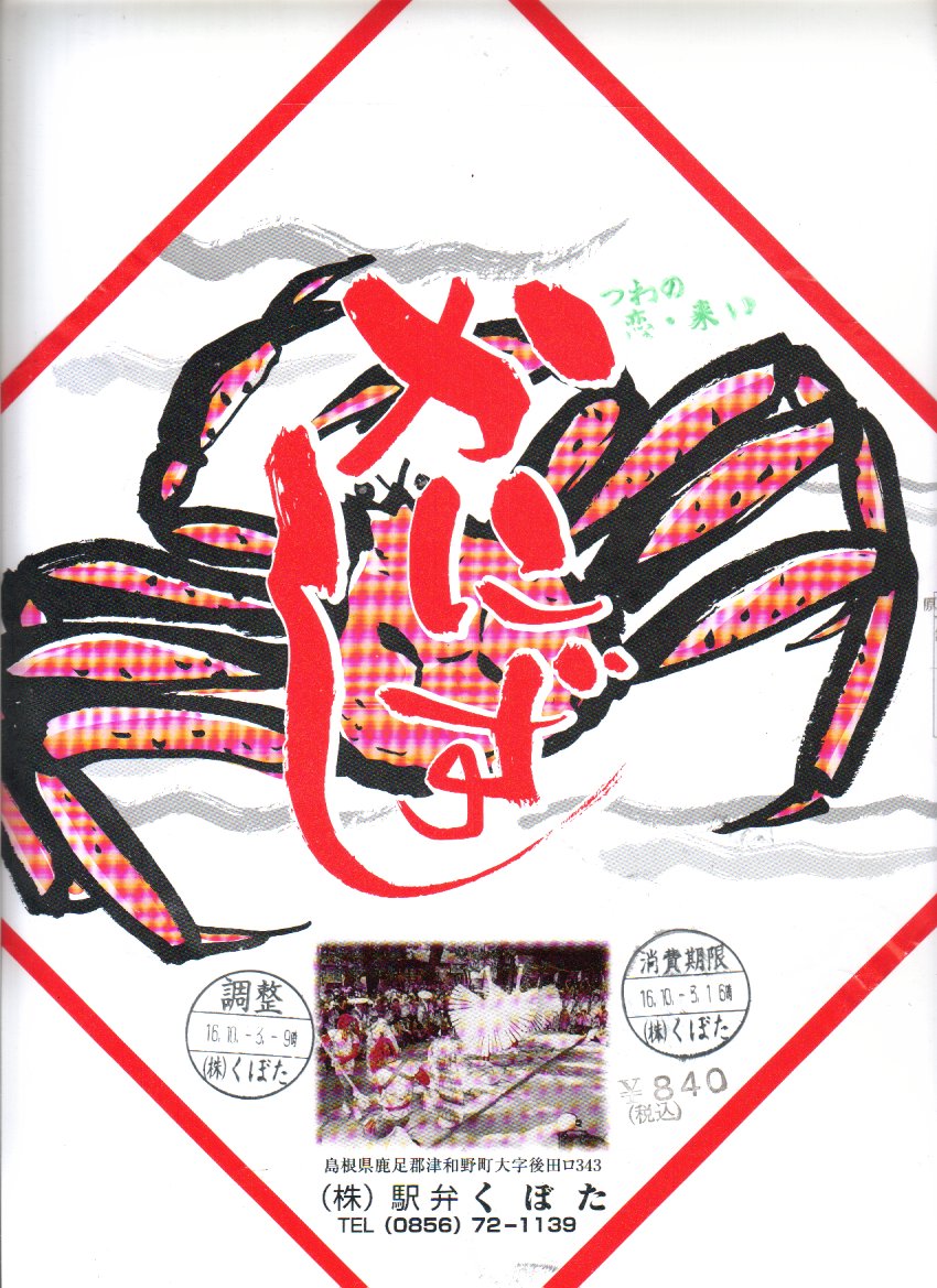 他の津和野駅弁と同じく、経木枠の正方形の容器に経木のふたをして、正方形の掛紙をかけてビニールひもでしばる。掛紙のカニのイラストの下の写真は、毎年7月下旬に津和野市街で開催される鷺舞(さぎまい)の風景。ここに「つわの恋・来い」の文字、原材料名、調製印、消費期限印、価格と5種類もの捺印がある。