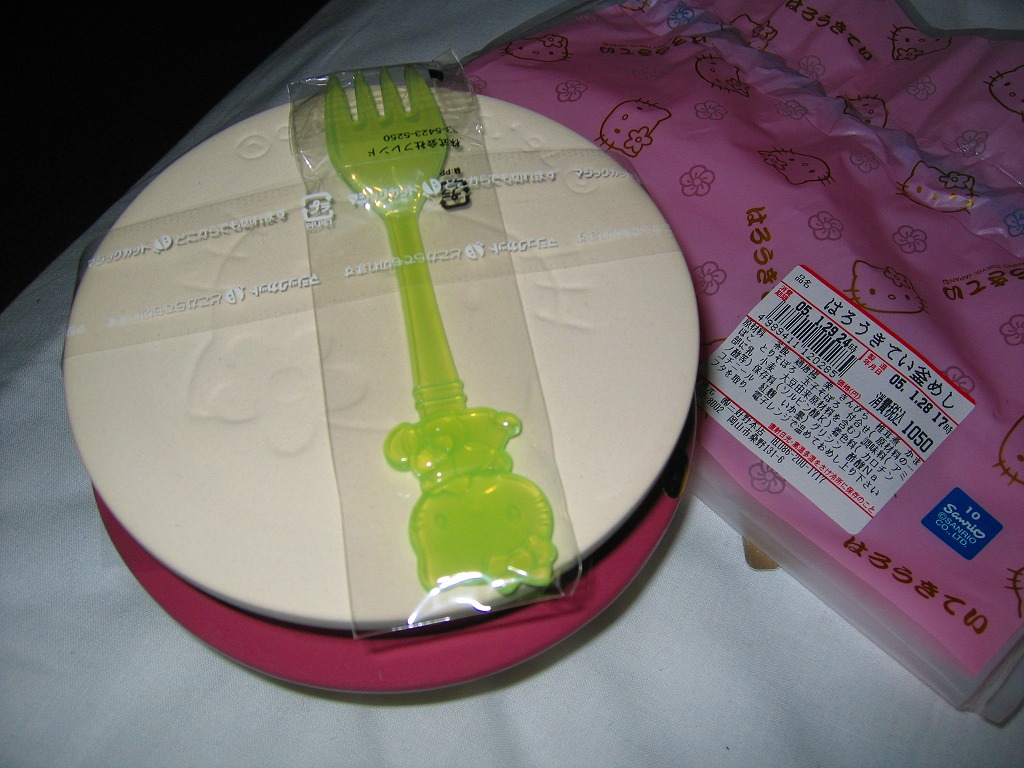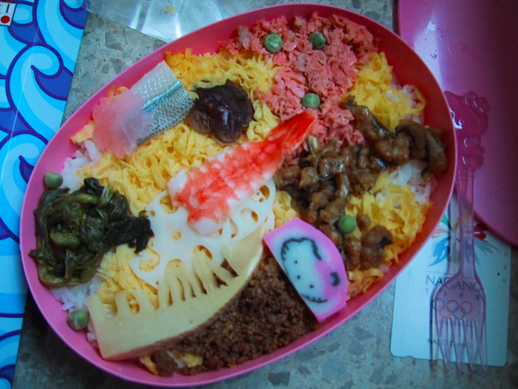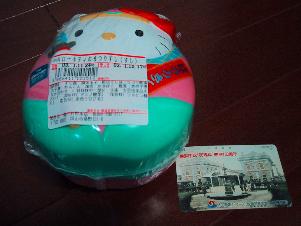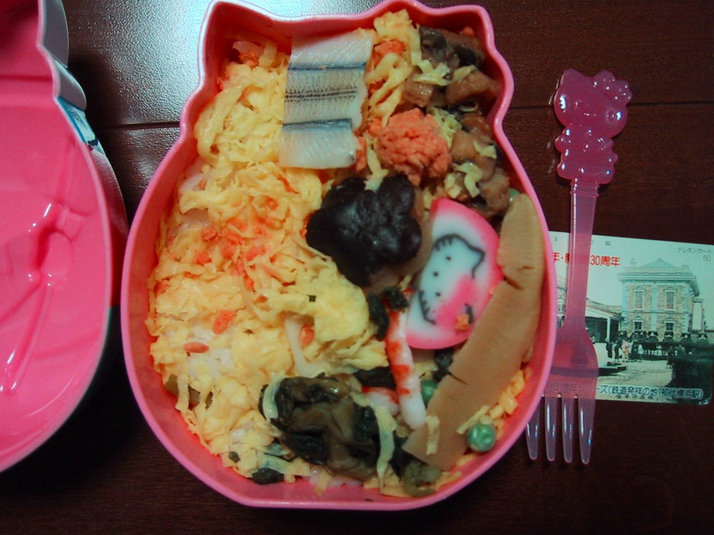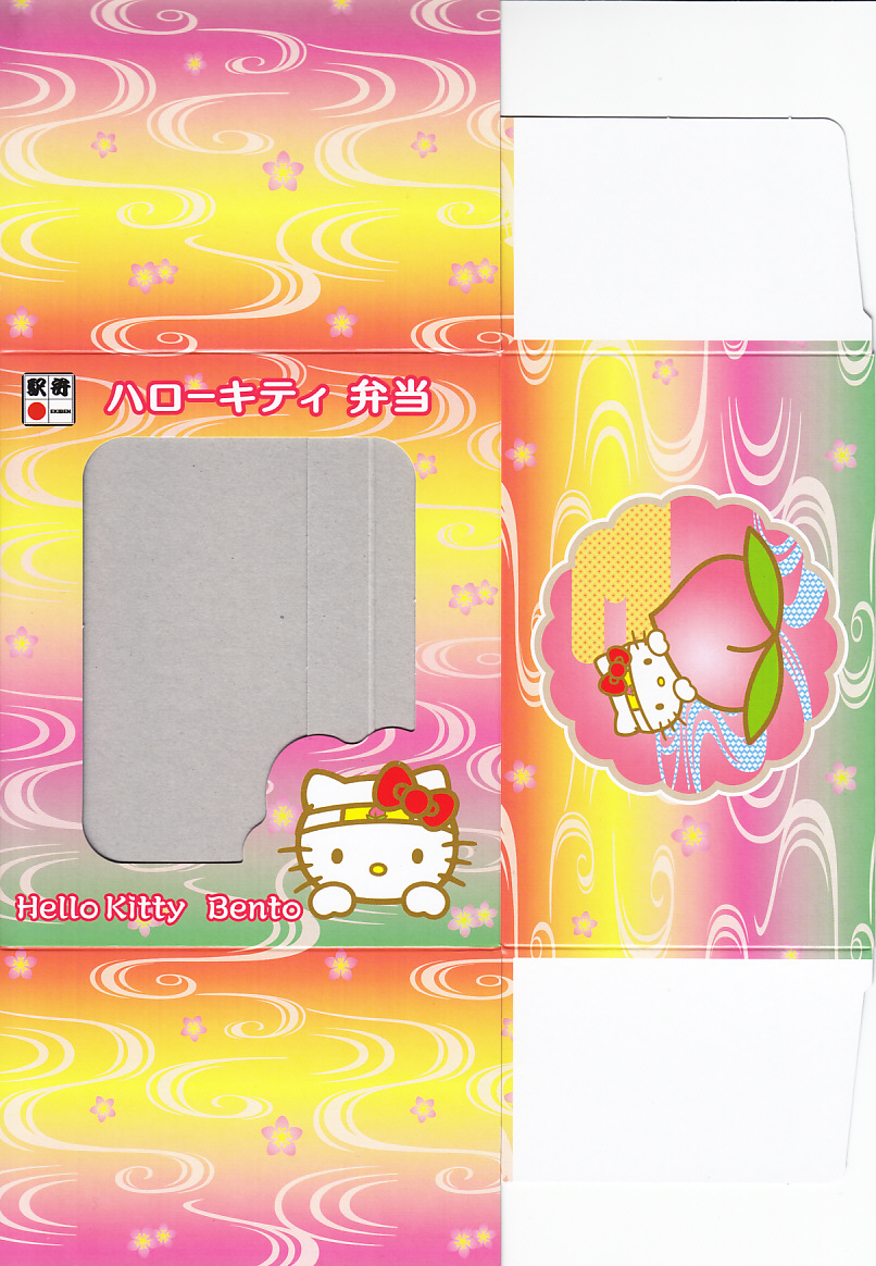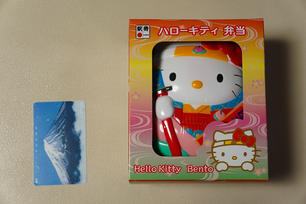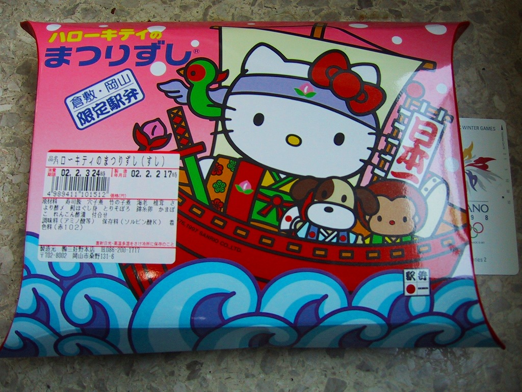 パッケージと容器はキティちゃんでいっぱい、付属のフォークもキティちゃんで、蒲鉾にも顔が入る。2002年3月に上記の駅弁「はろうきてぃのまつりずし」へリニューアル。