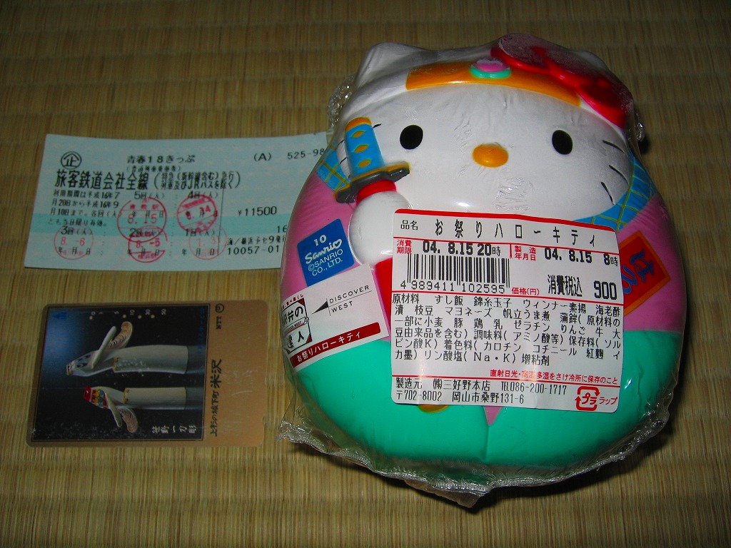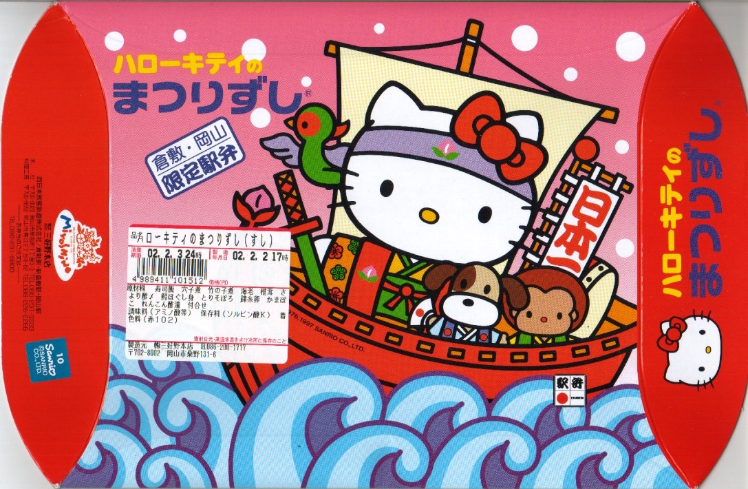 岡山の駅弁屋に研修というか武者修行に来ていた高崎と小田原の駅弁屋が、キャラクター駅弁のアイデアを地元に持ち帰ってキティちゃん駅弁を発売、その立体成型容器がうまくできていたことから、これを岡山の駅弁屋が逆導入したのだとか。2004年5月1日に上記の駅弁「お祭りハローキティ」へリニューアル。
