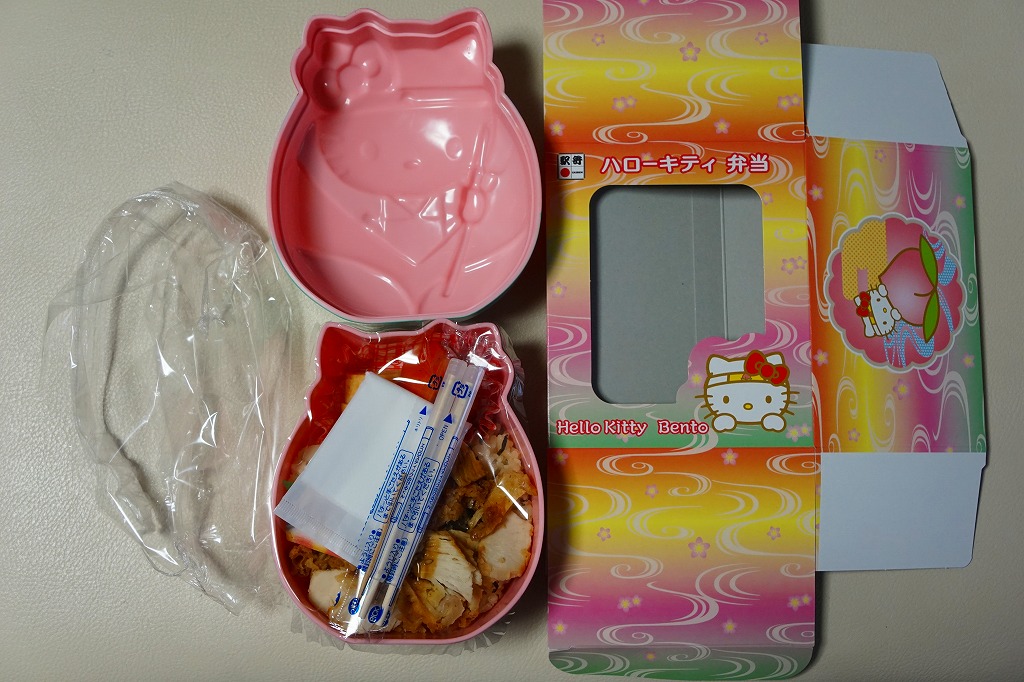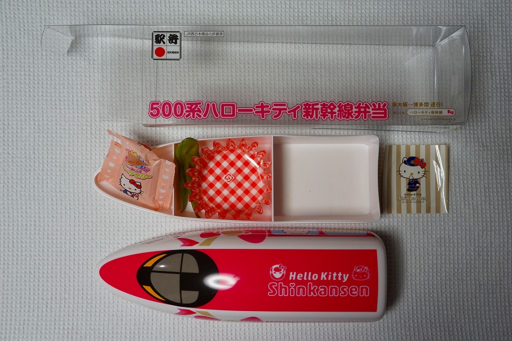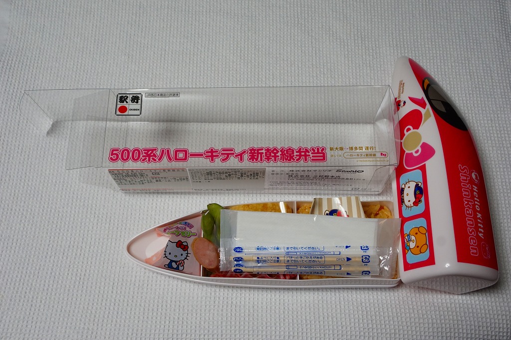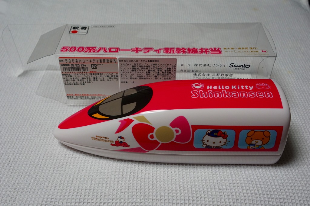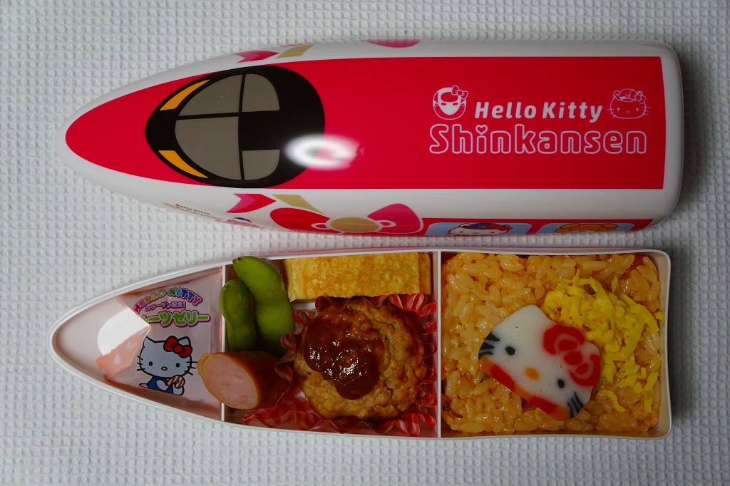 2018(平成30)年6月30日に岡山駅などで発売。同日に山陽新幹線の新大阪駅〜博多駅で運行を開始した「ハローキティ新幹線」と同時のデビューで、容器は新幹線の先頭車の形状と絵柄を模したプラ製。中身は中身はチキンライスにキティ顔のかまぼこを載せ、玉子焼、ハンバーグ、枝豆、ウインナー、フルーツゼリーというお子様ランチ。日本人よりむしろ外国人観光客に人気が出るかもしれない。価格は2018年の発売時や購入時で1,250円、2021年時点で1,280円、2022年9月から1,380円、2023年6月から1,480円。