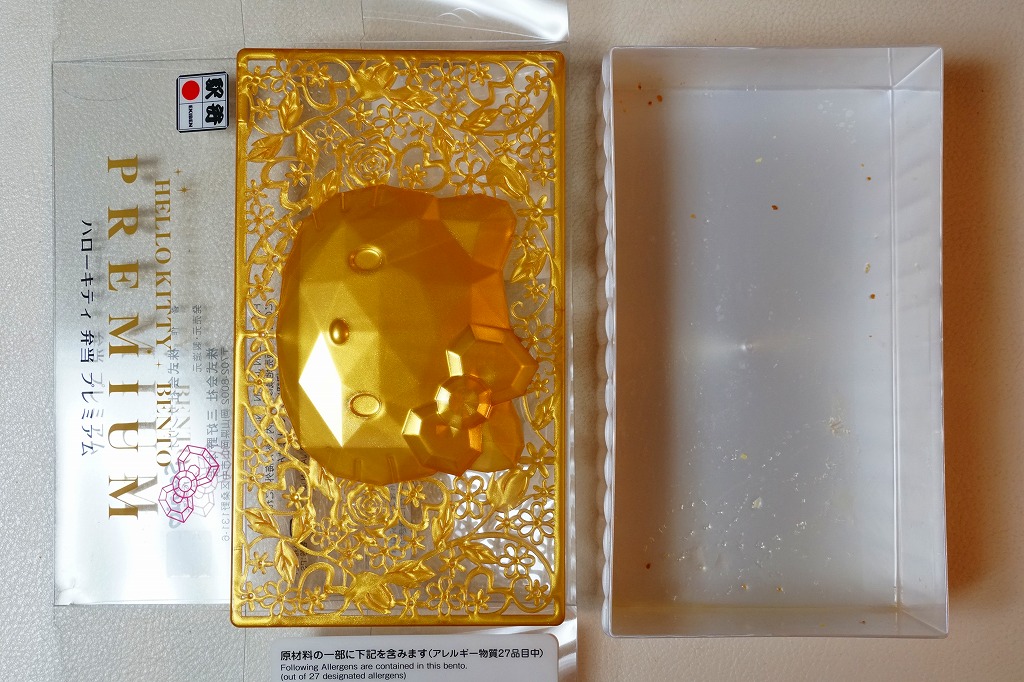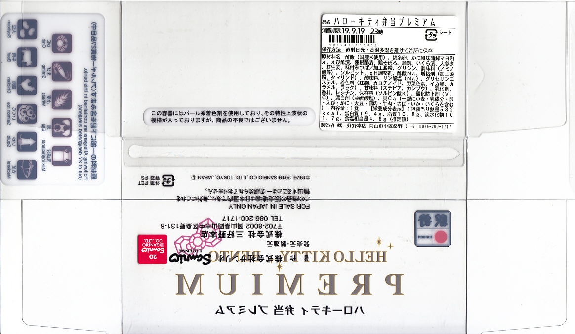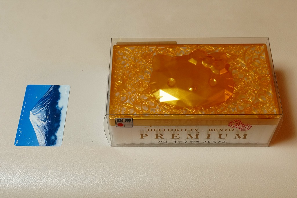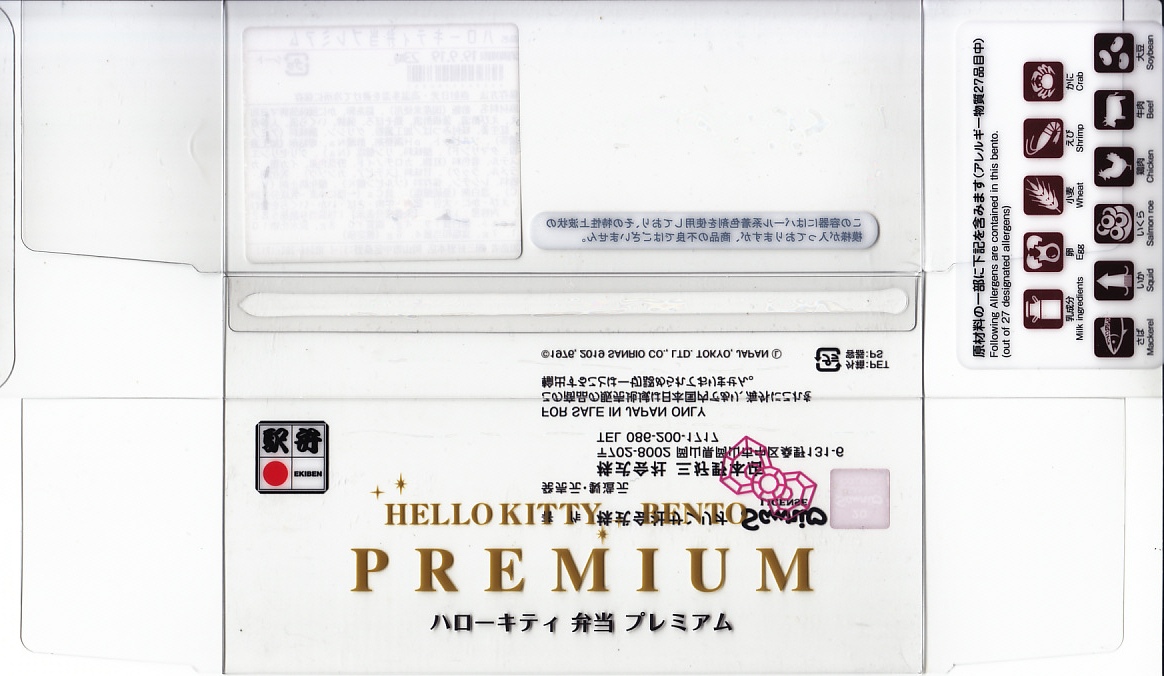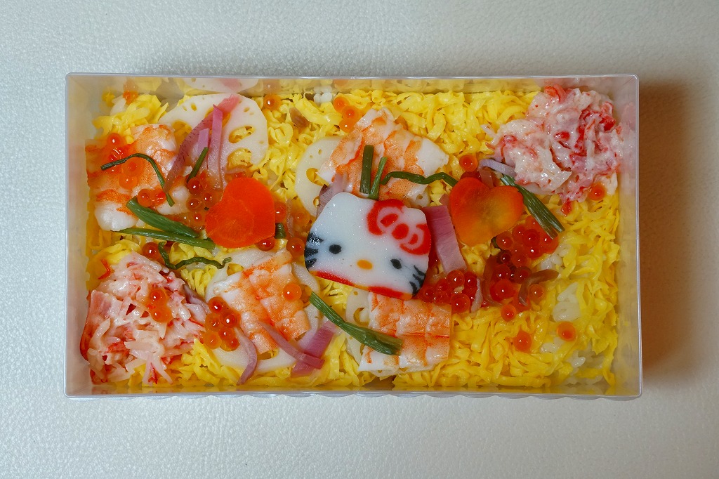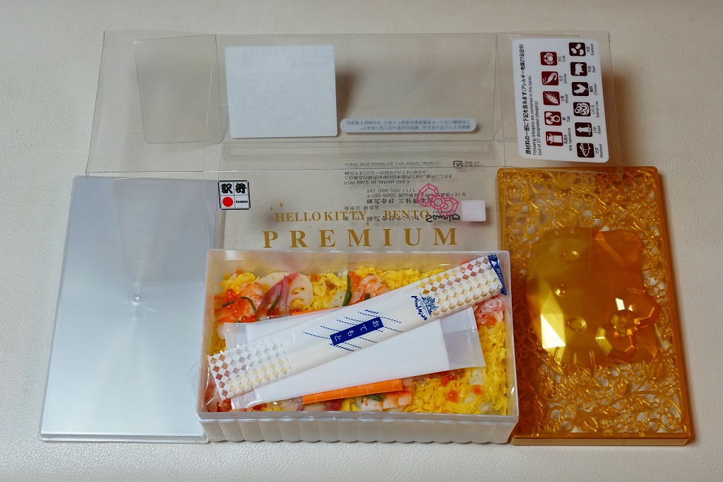 2019(令和元)年9月1日または5日の発売。プラ製ながら金銀の宝石箱を思わせる容器に、サンリオのキャラクター「ハローキティ」の顔が浮き出る。中身は酢飯を錦糸卵で覆い、エビ、カニかま、イクラ、レンコンなどを散らす、ちらし寿司ないし祭ずし。見た目の華やかさをプレミアムとするようで、ハローキティの45周年を記念した商品だそうな。2022年で終売か。