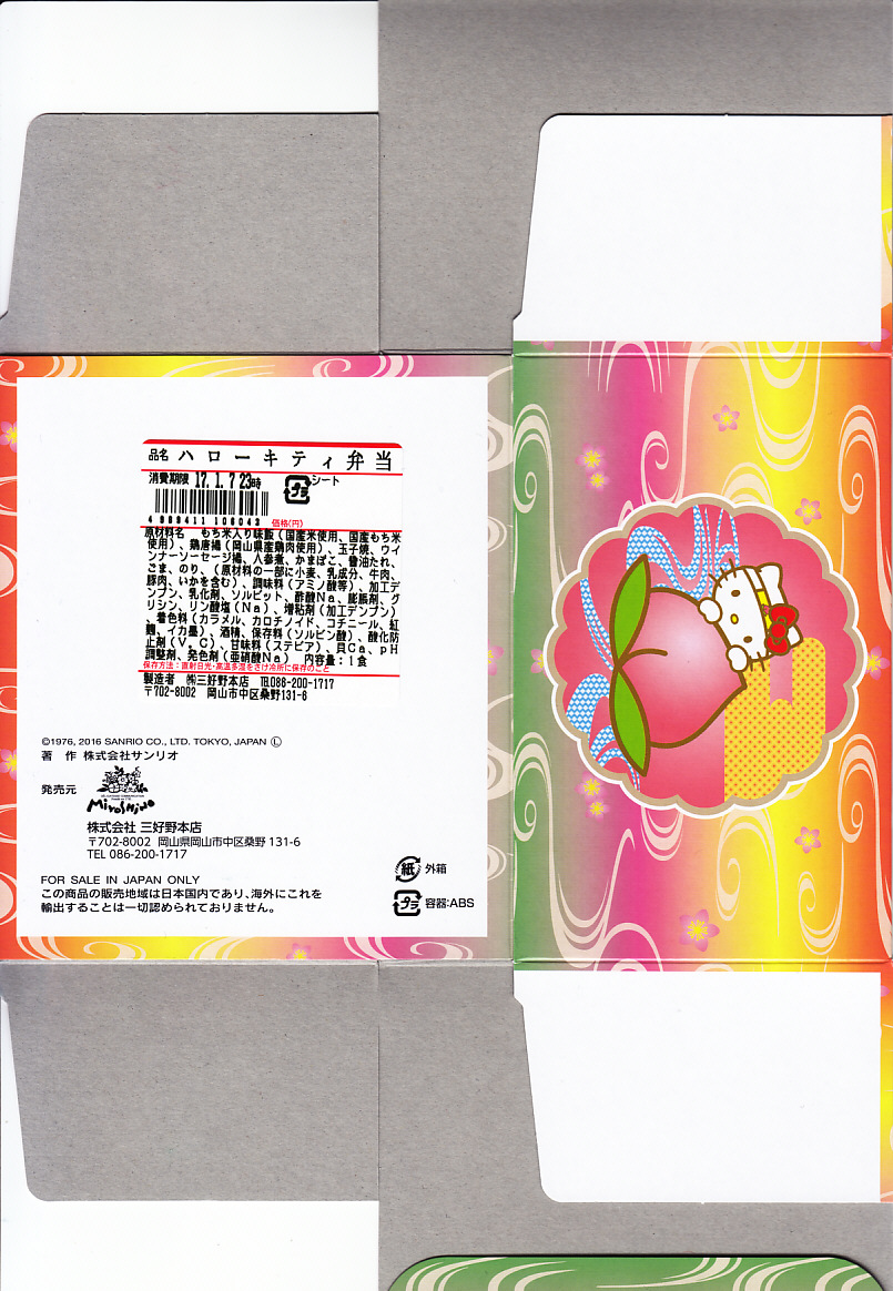 2016(平成28)年9月10日の発売。下記のとおり1999(平成11)年から脈々と続く、岡山駅のハローキティ駅弁の、2017年1月の購入時での最新作。桃太郎コスプレなキティちゃんのプラ容器は14年前から変わらず、今回はこれを桃の色と柄を持つボール紙製パッケージに収めた。
