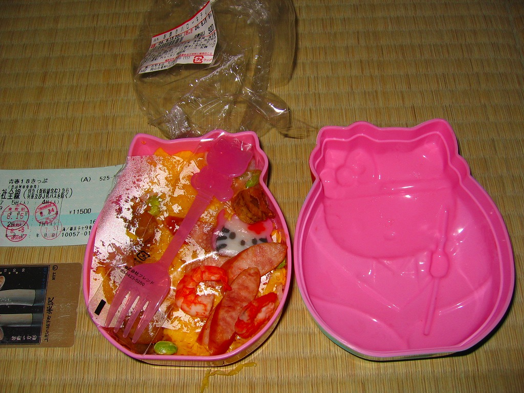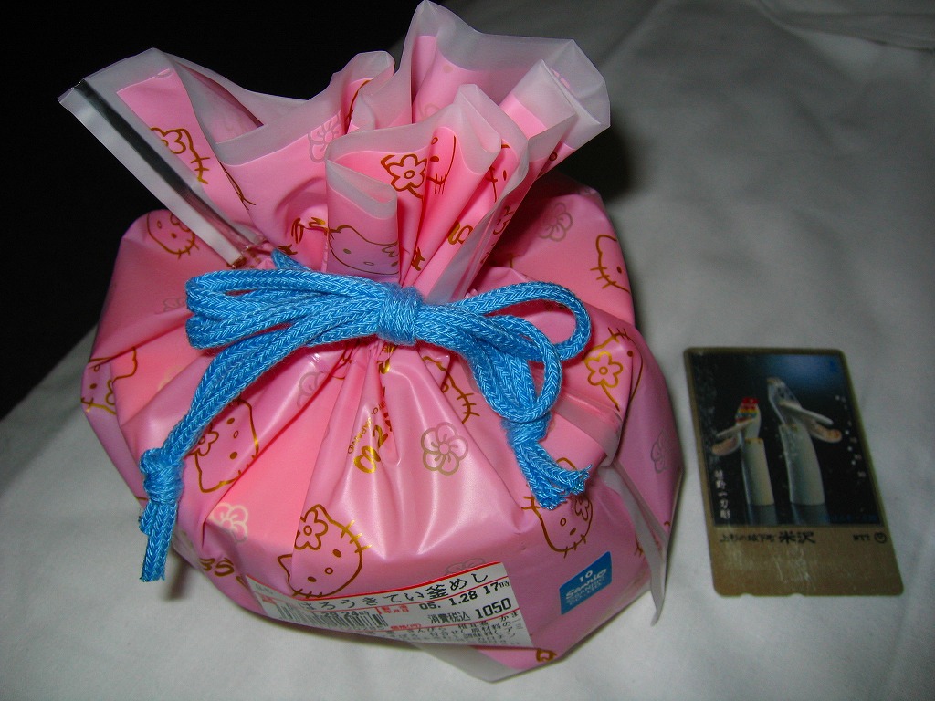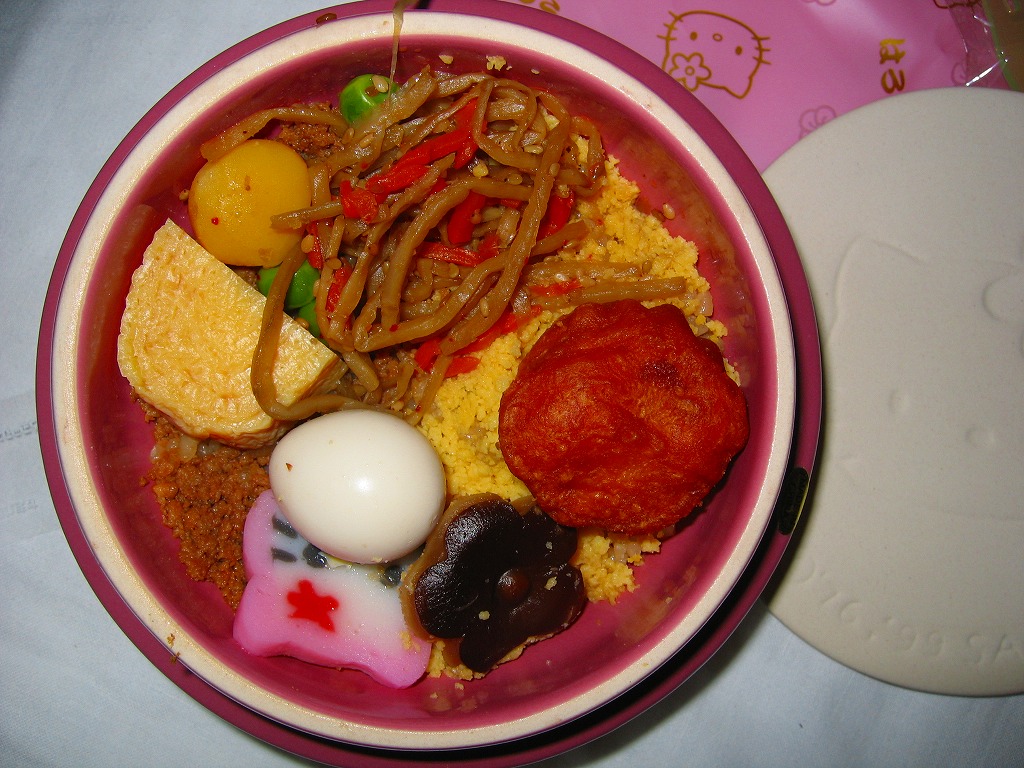 中身は備前米の茶飯の上に鶏そぼろと玉子そぼろ、チキンナゲットに栗にきんぴらごぼうに椎茸に玉子焼とうずらの卵、そしてキティ顔の蒲鉾を付ける、内容も風味も意外に本格的な釜飯駅弁。一日千個の限定発売と案内されるが、逆に一日でそんなにたくさん出るのかと思う。現在は売られていない模様。
