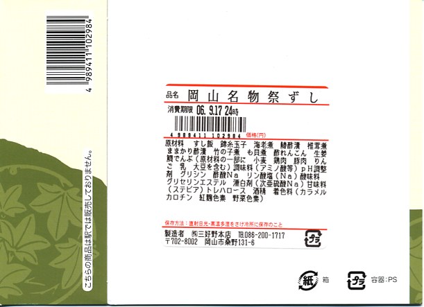 約11センチ四方の容器の中に甘めの酢飯を詰めて錦糸卵を敷き、ママカリ酢漬、サワラ酢漬、椎茸、蓮根、有頭海老などを貼り付ける。内容は岡山駅弁らしいし、風味も岡山駅弁のもの。具の密度が濃い分だけ、岡山駅弁の通常版より感覚的な豪華さは上だろう。現地にミニ祭ずしの需要があれば、併売されてもよいと思う。1シーズンで消えたらしい。