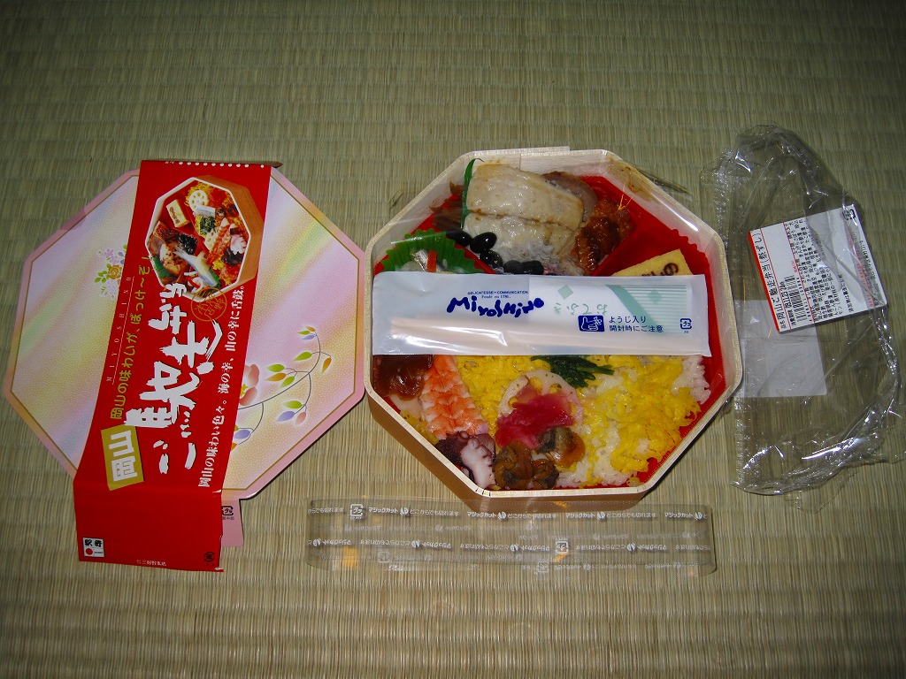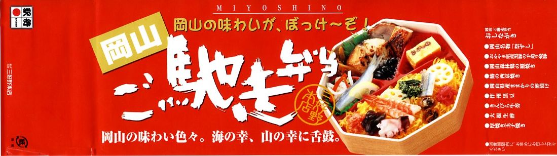 2007年までには発売していた模様。正八角形の経木枠の容器に、調製元汎用のボール紙のふたをして、輪ゴムで留めてラップで包んで食品表示ラベルを表裏に貼り、大阪と岡山の名物駅弁の名前を足して2で割ったような名前を付ける。