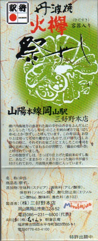 2001(平成13)年に発売。なぜか兵庫県丹波焼の美しい容器を使用し、中身は御飯の上に錦糸卵が敷かれ、ママカリやエビや椎茸やタケノコが載る、つまり岡山名物祭ずし。量は少なく、価格の多くは容器代に費やされているようだが、確かに容器に手抜かりはなく、茶碗として十分実用に耐えるばかりでなく観賞用にも向く。福井の業者が「日本窯元めぐり」として加賀温泉・名古屋・豊橋・草津・岡山・和田山の各駅の駅弁業者に声を掛け、同じ大きさの容器と同じ値段で6種の駅弁をプロデュース、駅弁大会に売り込んだのだろう。現地で入手できたかは不明。