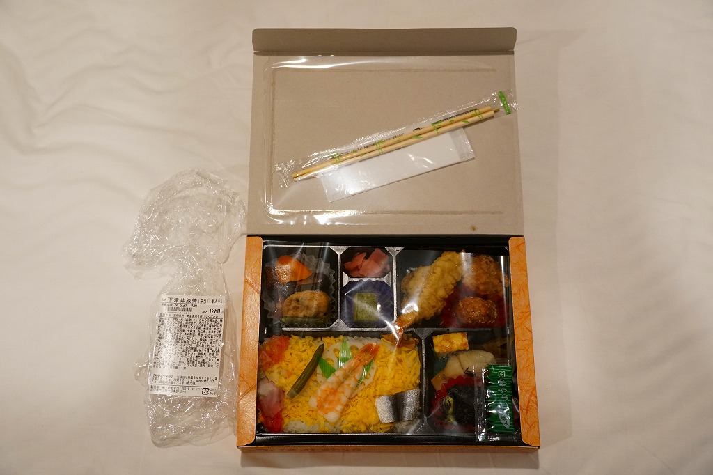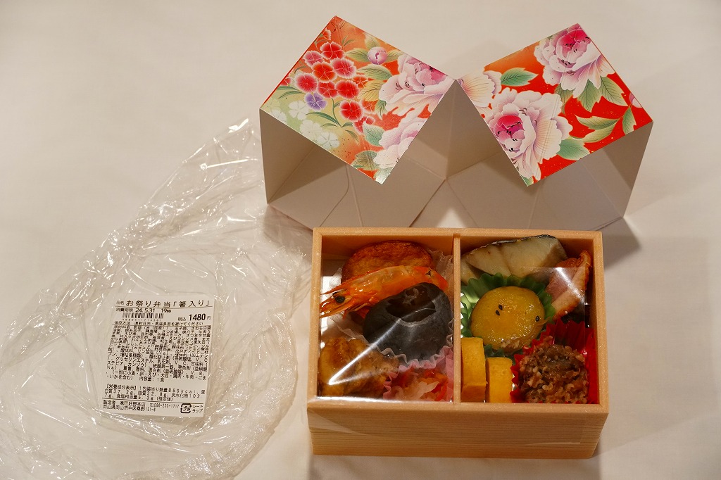 赤いプラ製トレーに収まる中身は、半分が岡山駅弁名物の祭ずし、半分が焼醤油鮭、鶏肉山賊焼、牛肉うま煮、昆布巻にがんもどきにサトイモやゴボウなどの煮物、玉子焼、ひじきなど。つまり、祭ずしにおかずを付けたもので、駅弁でも街弁としても活躍できそうなタイプ。価格は2008年の購入時で900円、2014年4月の消費税率改定で930円、2019年時点で900円、2022年8月から1,000円。2023年6月15日限りで終売。