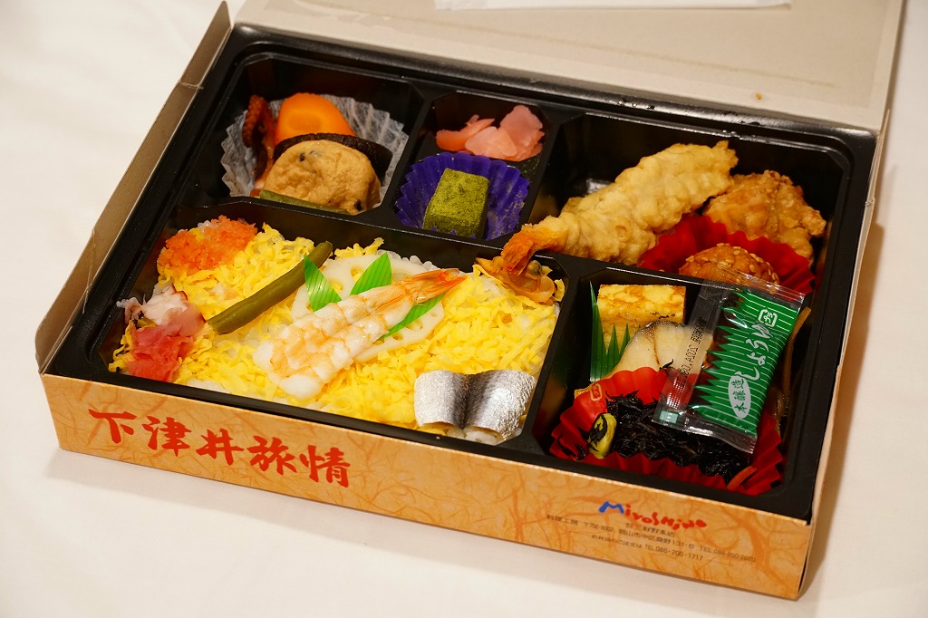 岡山駅でよく売れているという幕の内弁当。黒いプラ製トレーを、下津井港を描いたボール紙製の専用容器に詰めて、ラップで包んで食品表示ラベルを貼る。中身は祭ずしにイイダコやタケノコなどの煮物、エビの天ぷらやレンコン磯部揚、サワラの白焼きや玉子焼、肉団子に大学芋にワラビ餅など。内容が岡山らしく、多種多様な味も楽しめる。価格は2009年時点で1,050円、2014年4月の消費税率改定で1,080円、2022年8月から1,180円、2023年6月から1,280円。