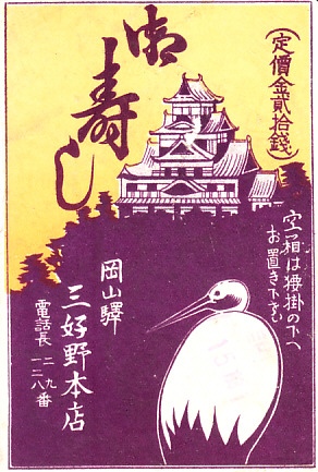 おそらく1910年代、大正時代のものと思われる、昔の岡山駅弁の掛紙。岡山城と丹頂鶴を描いたのだろう。同じ頃の掛紙と思われる上等御辨當より安価な駅弁だからかどうか、図柄がそれより簡略だと思う。