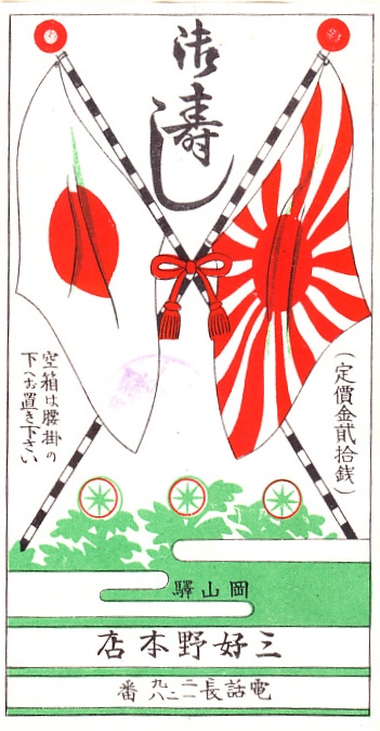 昭和20年代のものと思われる、昔の岡山駅弁の掛紙。漢字が右上スローガンの「駅」は新字体で価格は旧字体であるが、当時は両者が混用されていたのだろうか。