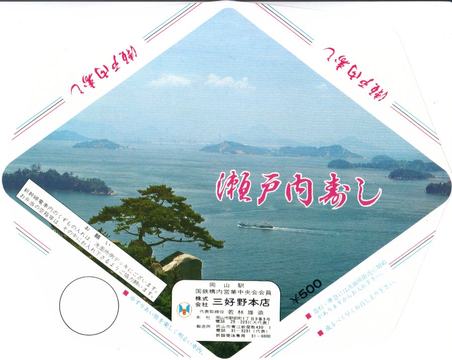 入手状況から1977(昭和52)年の調製と思われる、昔の岡山駅弁の掛紙。瀬戸内海の島々を俯瞰したと思われる風景写真のみを載せる。このようなデザインの掛紙は、最近はとても少なくなったと思う。