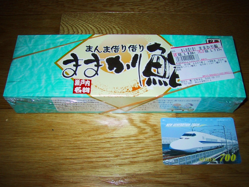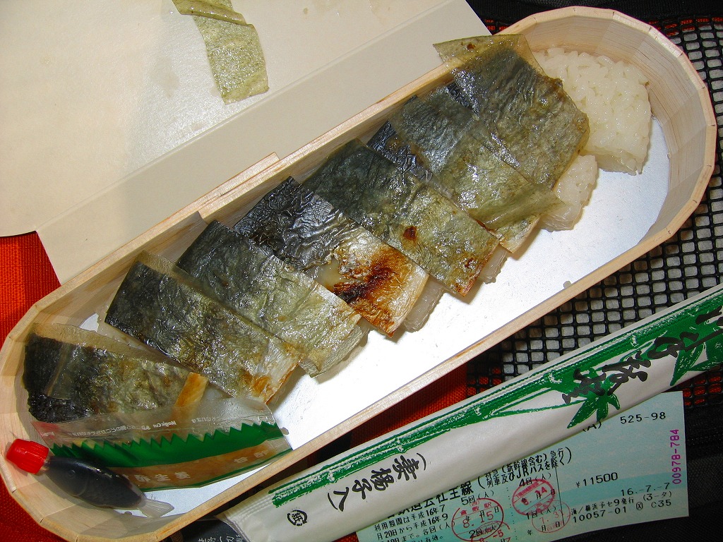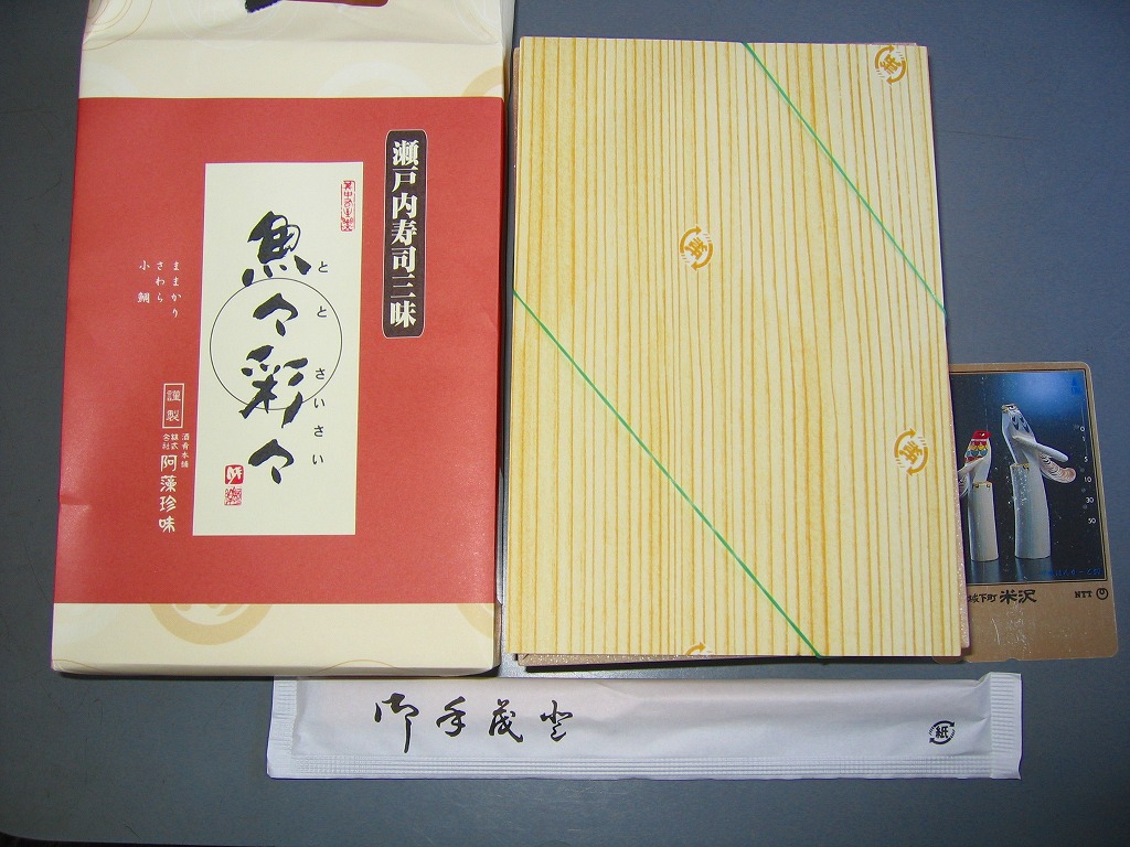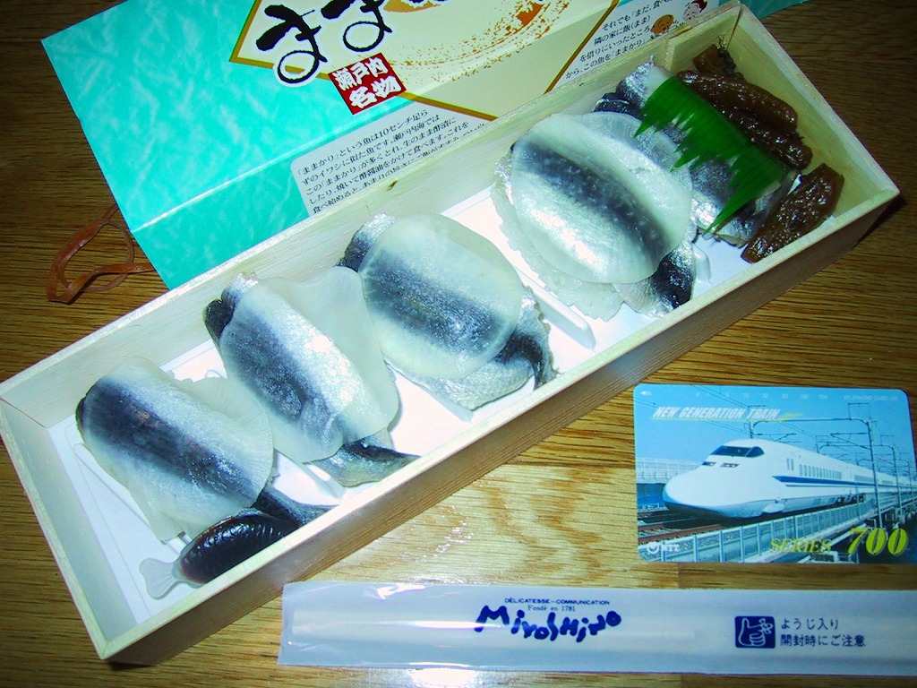 ふたと底面が紙製の長方形の容器を、まるで土産物のように糊付包装紙でしっかり包むので、うまくはがせずボロボロになった。中身は駅弁では珍しくさび抜きでない、小鯛二個・さわら二個・ままかり三個の、岡山県産朝日米での握り寿司。