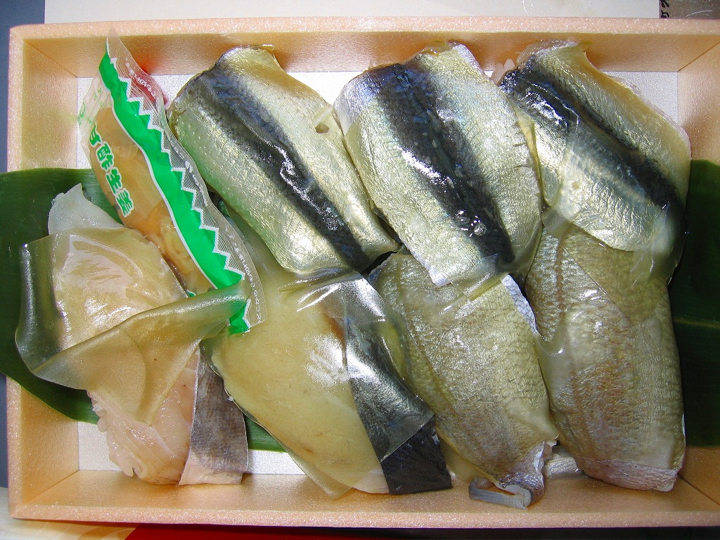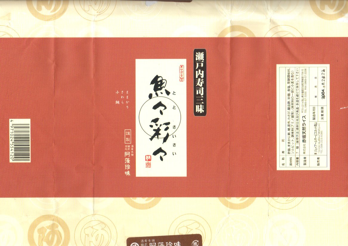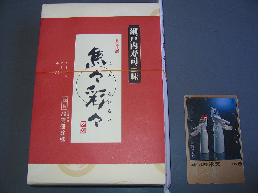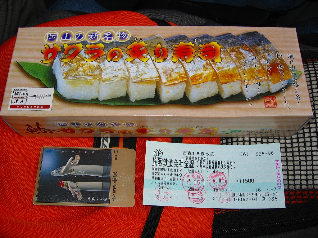 ふたと底面が紙製の長方形の容器を、まるで土産物のように糊付包装紙でしっかり包むので、うまくはがせずボロボロになった。中身は駅弁では珍しくさび抜きでない、小鯛二個・さわら二個・ままかり三個の、岡山県産朝日米での握り寿司。