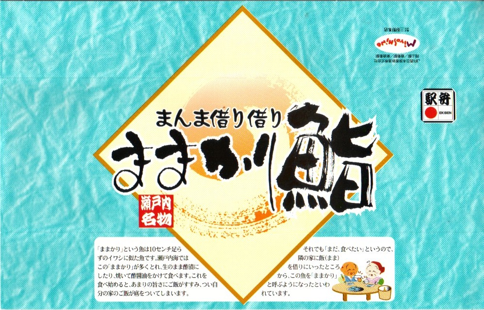 1982(昭和57)年に発売。長方形の容器の中にママカリのにぎり寿司が配列されている、シンプルな駅弁。ママカリとはニシン科の小魚で「さっぱ」とも呼ばれ、酢で締めると御飯を近所から借りてくるくらい食が進むので「ままかり」の名が付いたのだとか。岡山の駅弁にはたいてい入っている。埋立の進展で、岡山駅は海からかなり遠くなった。2013年頃に終売か。