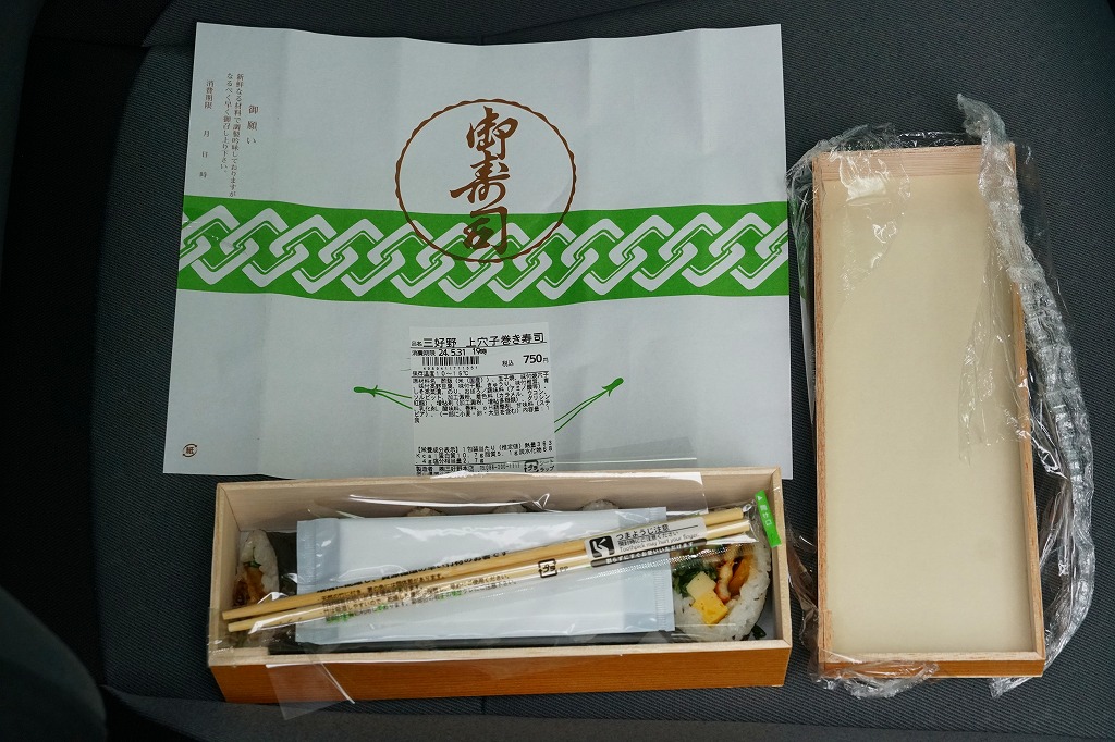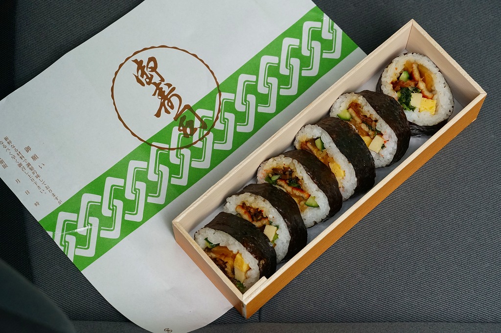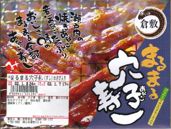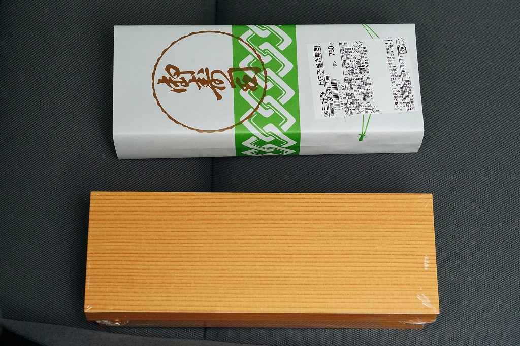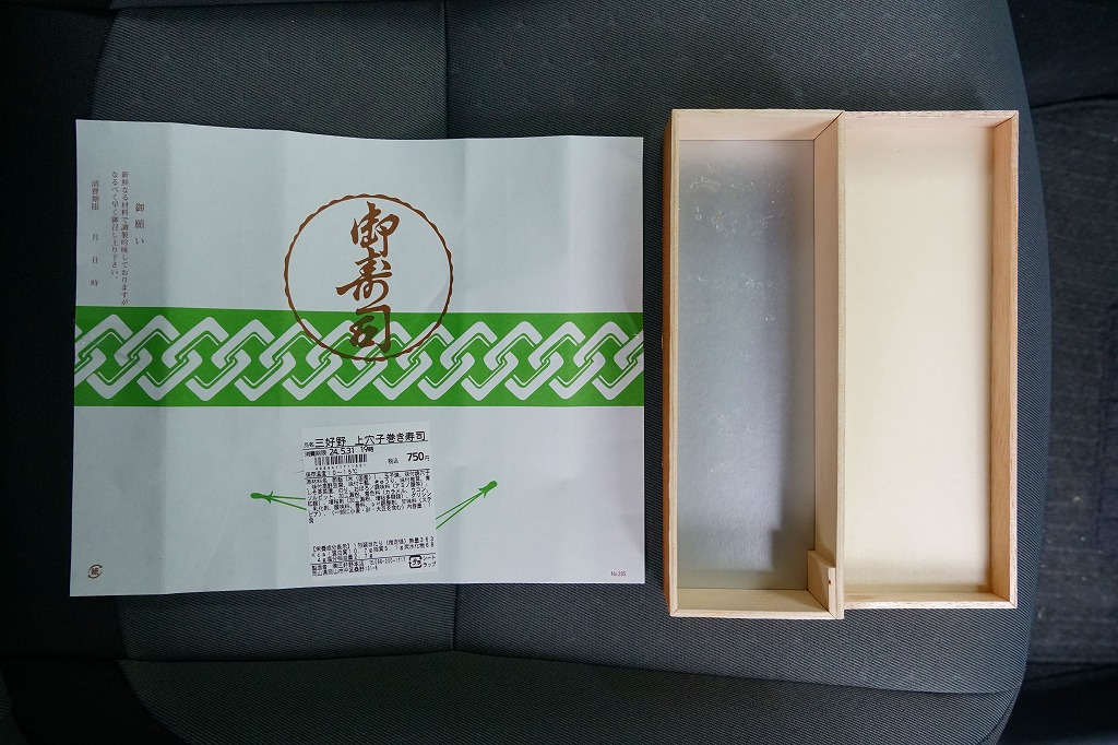 岡山駅の駅弁売り場で買えた太巻き寿司。調製元も売り場も間違いなく、岡山駅弁の三好野本店だが、これが駅弁と紹介されたことを見たことがない。掛紙の絵柄や、細長い折箱に太巻き寿司を6切れ折り重ねて掛紙を巻く姿は、昭和30年代や第二次大戦前の駅弁だと言われても信じてしまいそう。「消費期限」やリサイクル識別マークや食品表示の存在で、21世紀の商品であることに気が付く。商品名は掛紙で「御寿司」、食品表示で「三好野上穴子巻き寿司」。玉子焼と焼穴子と、かんぴょうと高野豆腐、きゅうりと椎茸と高菜漬を、酢飯と海苔で巻いた、具だくさんで実用本位の太巻き寿司。
