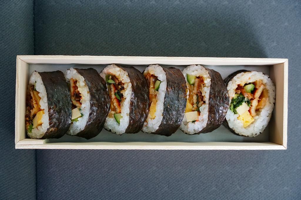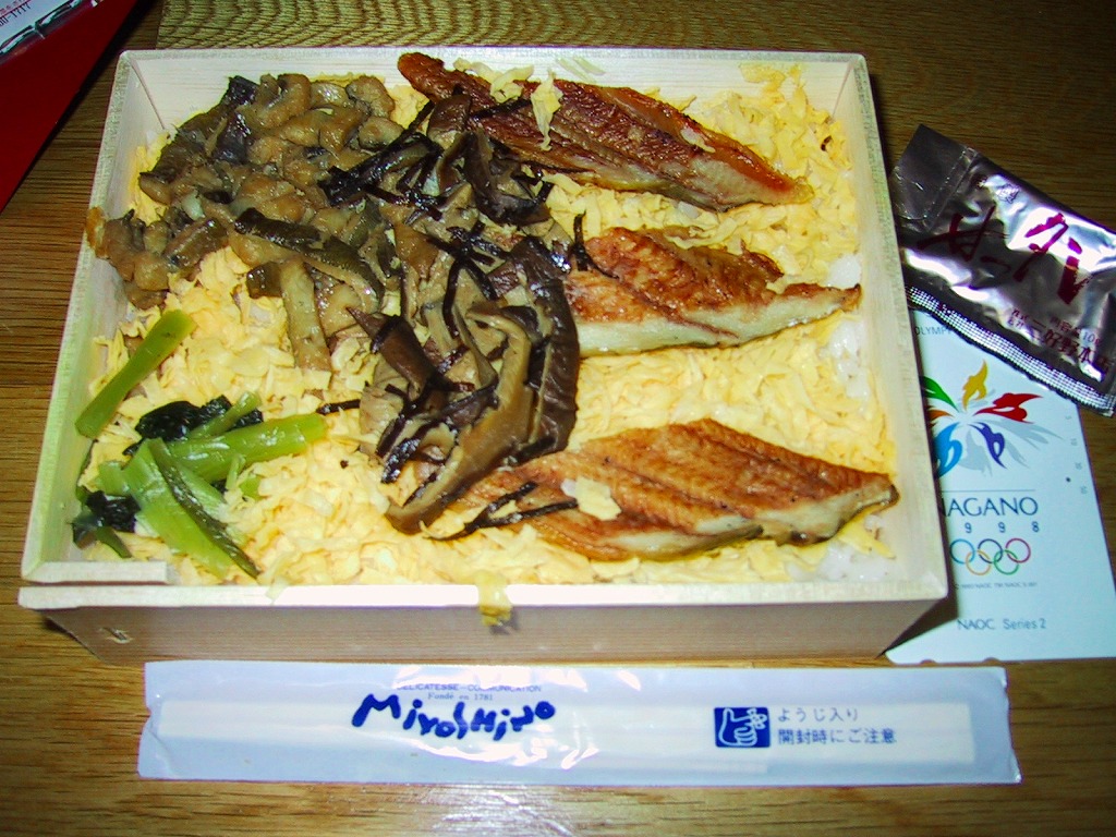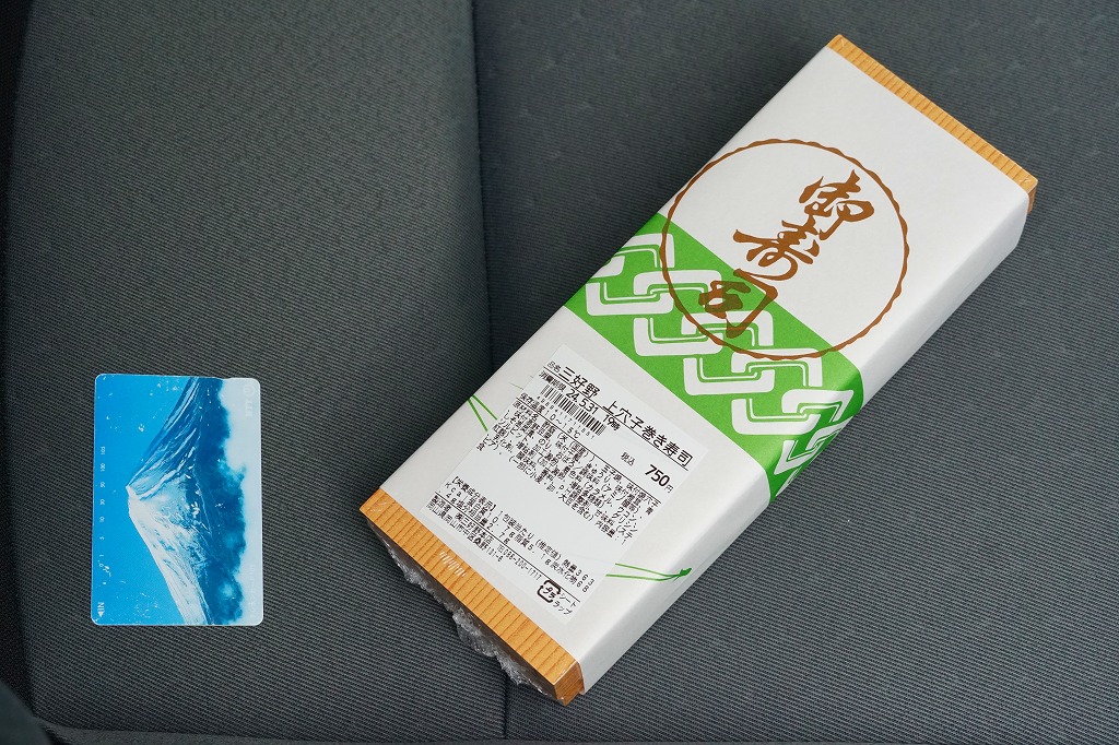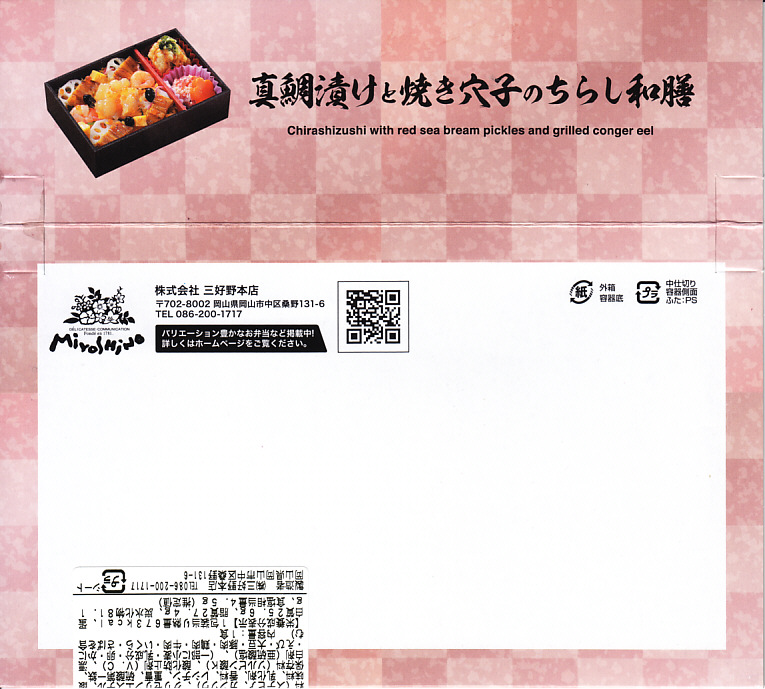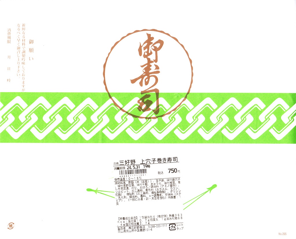 岡山駅の駅弁売り場で買えた太巻き寿司。調製元も売り場も間違いなく、岡山駅弁の三好野本店だが、これが駅弁と紹介されたことを見たことがない。掛紙の絵柄や、細長い折箱に太巻き寿司を6切れ折り重ねて掛紙を巻く姿は、昭和30年代や第二次大戦前の駅弁だと言われても信じてしまいそう。「消費期限」やリサイクル識別マークや食品表示の存在で、21世紀の商品であることに気が付く。商品名は掛紙で「御寿司」、食品表示で「三好野上穴子巻き寿司」。玉子焼と焼穴子と、かんぴょうと高野豆腐、きゅうりと椎茸と高菜漬を、酢飯と海苔で巻いた、具だくさんで実用本位の太巻き寿司。