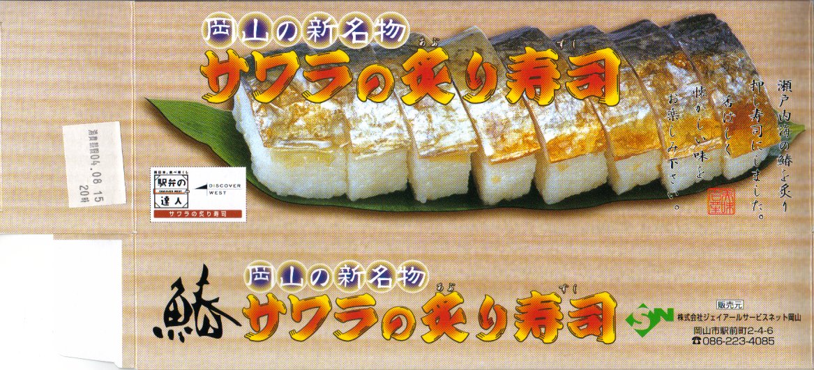 JR西日本の駅弁キャンペーン「駅弁の達人」の実施に伴い、2004年5月1日に発売。長円形経木枠の容器に鰆(さわら)をあぶって載せた棒寿司が一本入る。味はまさに焼き魚定食、棒寿司でもバッテラでもなく、御飯の上に焼き魚が載った感じで、そう考えればなかなかいける。調製元は岡山市内の割烹料亭らしい。