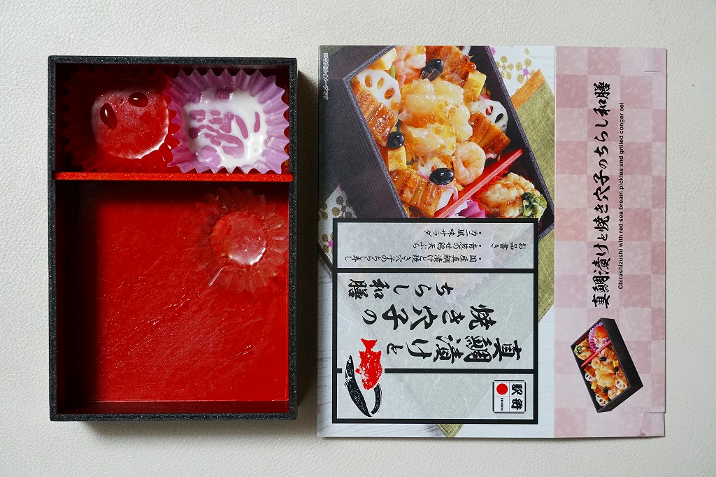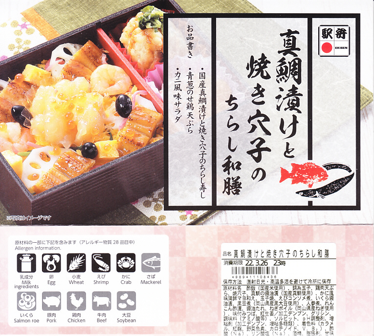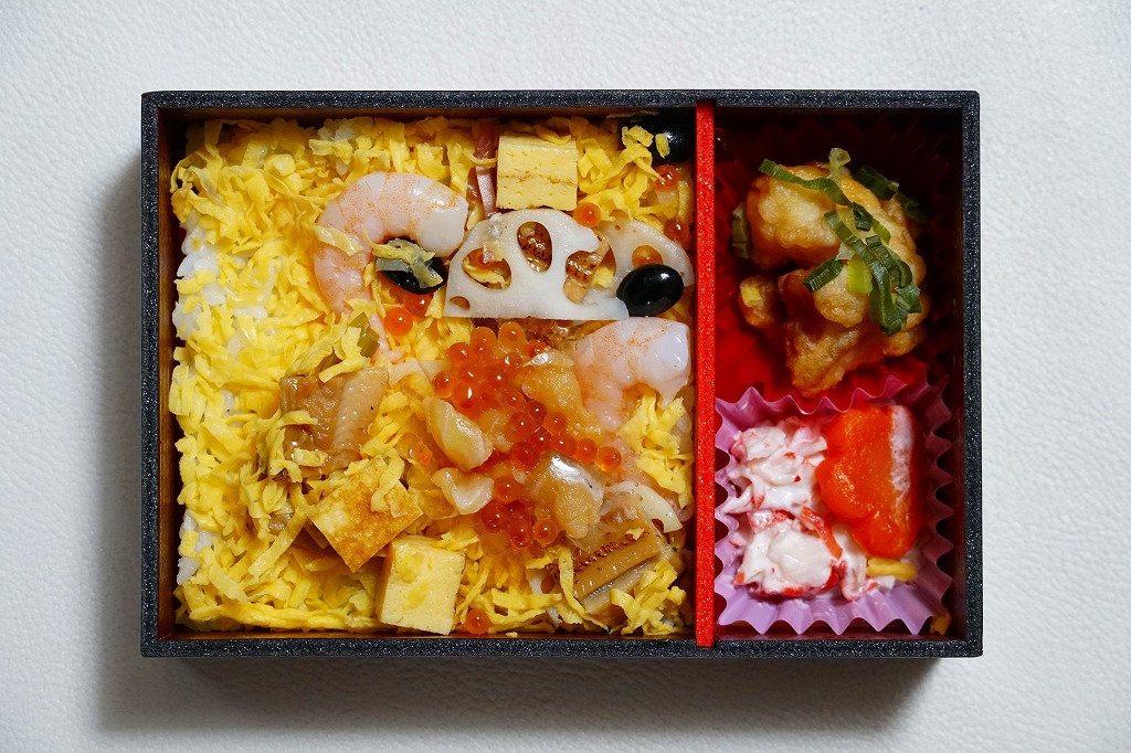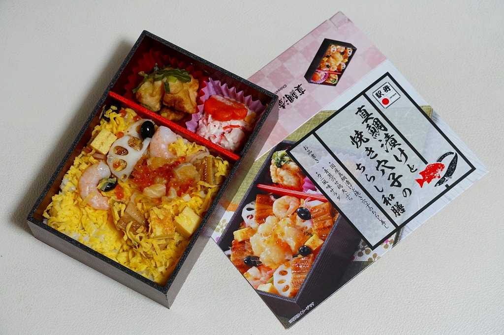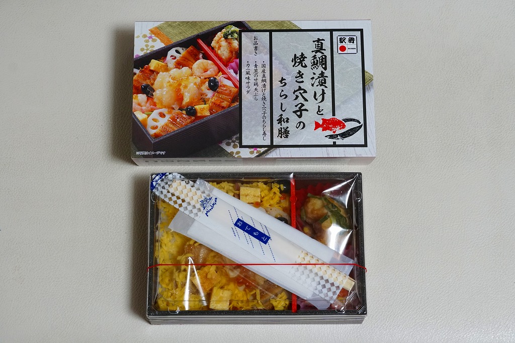 秋冬の駅弁大会シーズンに向けた、2021(令和3)年秋の新商品か。四角い容器に酢飯を詰め、錦糸卵で覆い、真鯛の醤油漬け、焼穴子、えび、いくら、玉子焼、れんこん、黒豆を散らし、鶏肉天ぷら、かに風味かまぼこ、にんじんを添える。名物か名産なのか何なのか、よくわからないけれど食べておいしかったと思えるお弁当。2022年7月限りで終売。