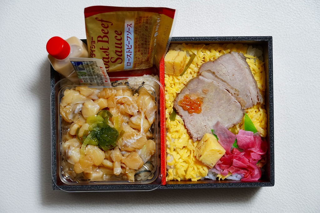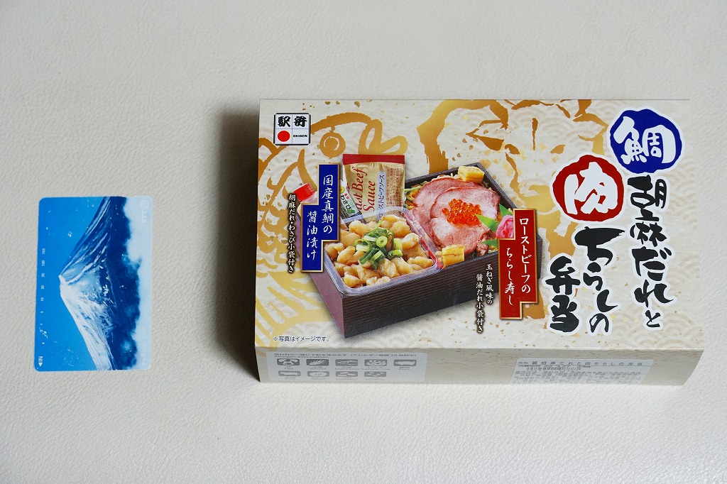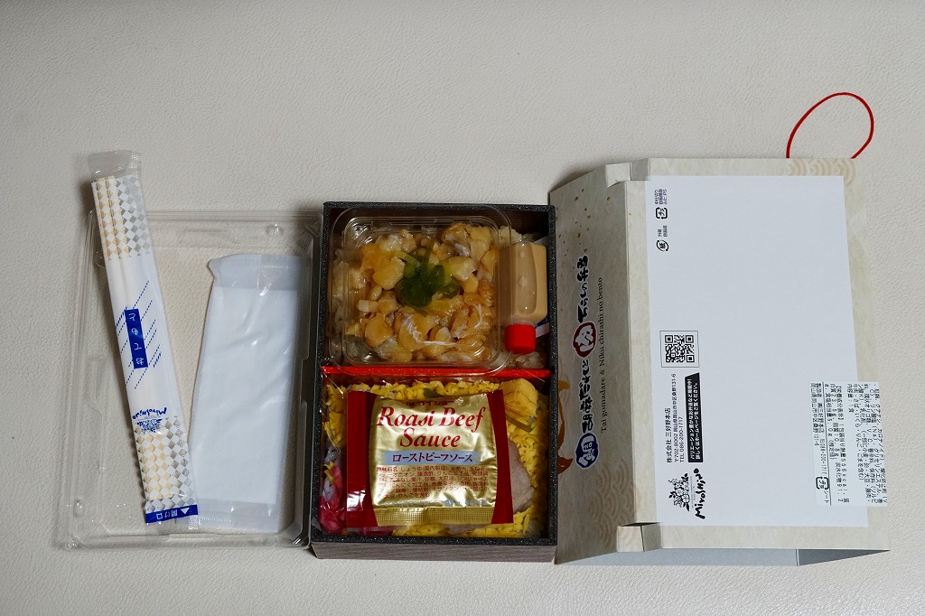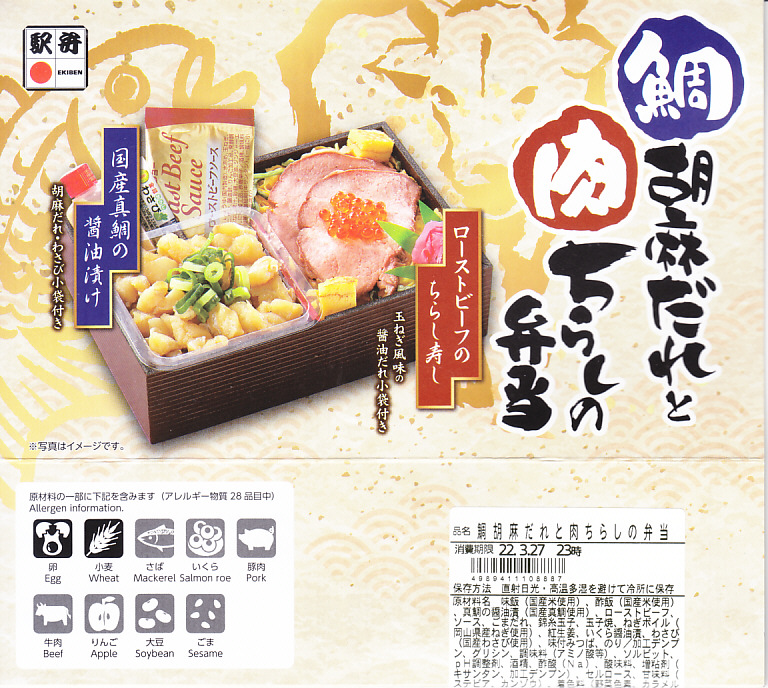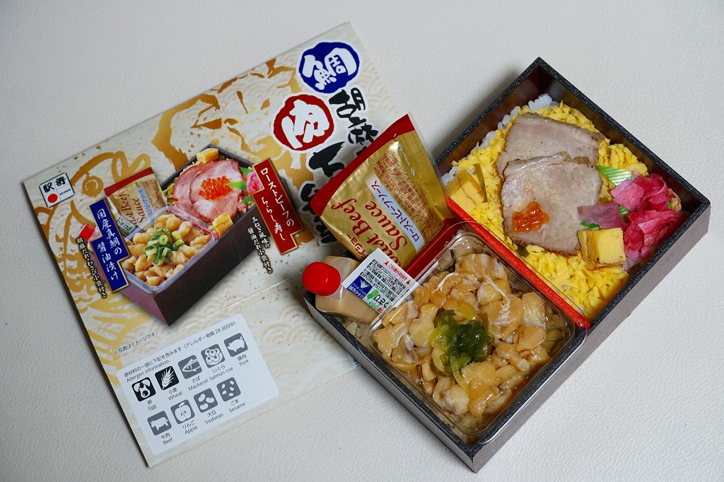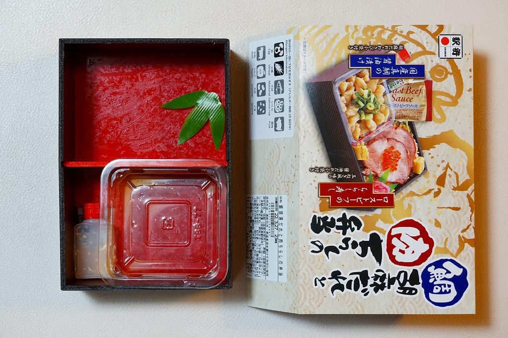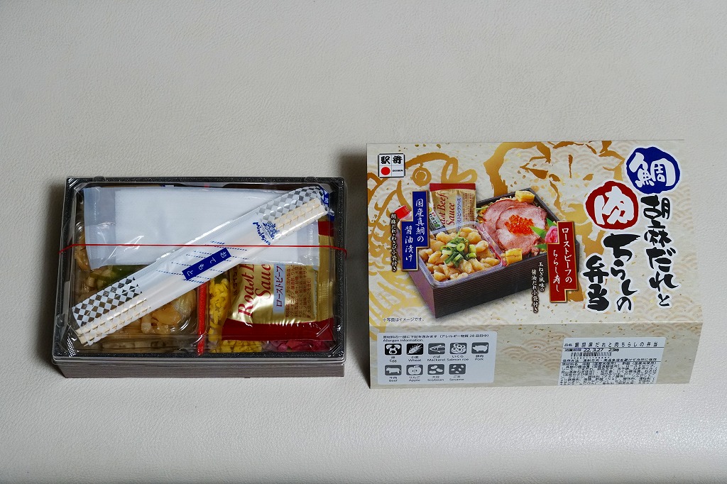 2022(令和4)年1月1日に発売。中身はスリーブの写真や商品名のとおり、茶飯に国産真鯛の醤油漬けとネギのトレーを載せて、胡麻だれとわさび小袋を添えて半分、酢飯を錦糸卵や玉子焼とローストビーフで覆い、イクラを載せて紅生姜を添えてローストビーフソースの袋を被せて半分。右と左で味も中身もまるで異なる構成は、ひとつでふたつの内容を楽しめると思うか、組合せのミスマッチを嘆くか。高価な駅弁で、収穫報告がほとんどみられない。2022年で終売か。