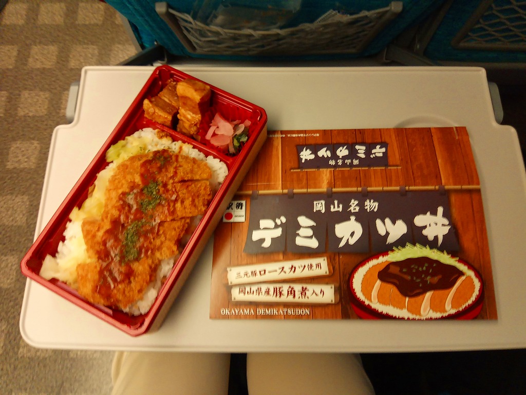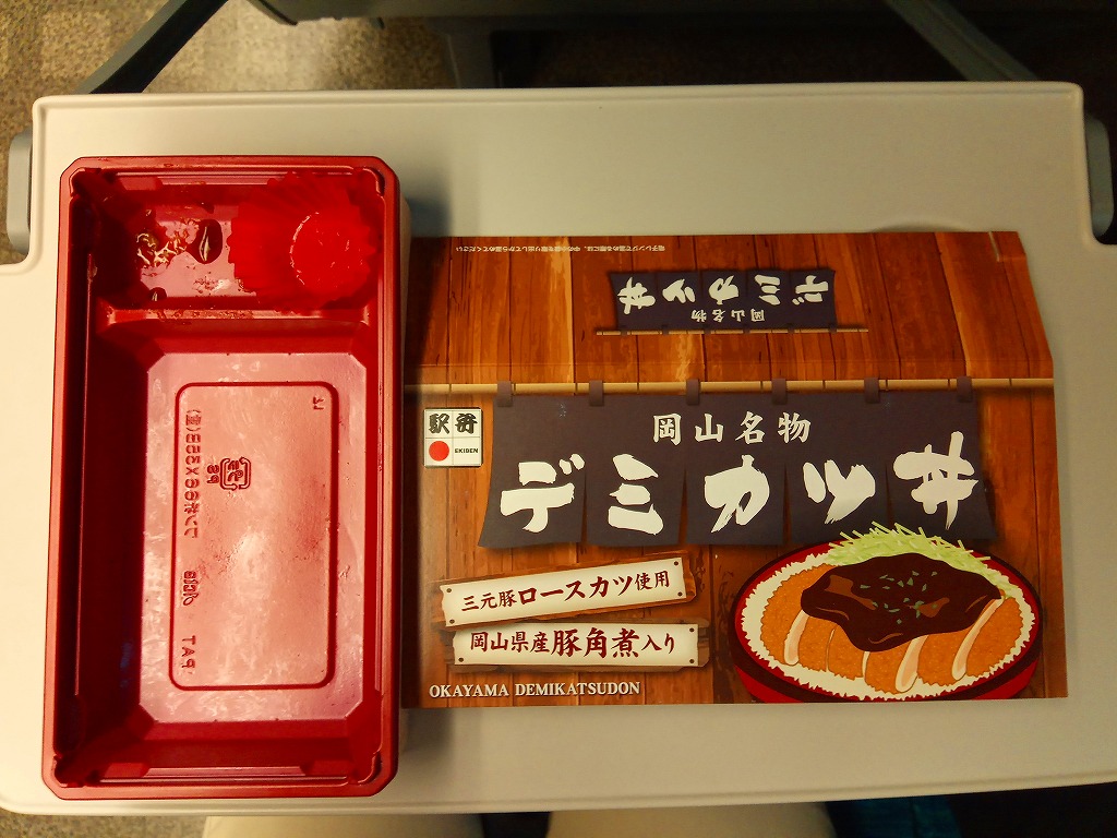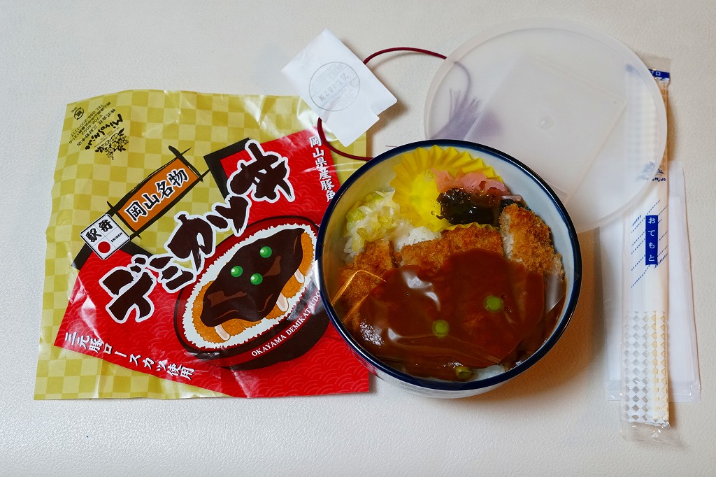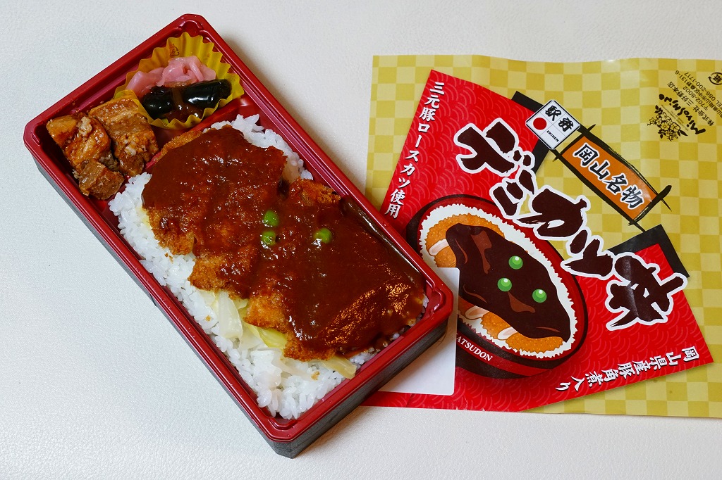 2020(令和2)年1月に発売、同月の京王百貨店の駅弁大会で実演販売。岡山のご当地グルメとして売り出し中のデミカツ丼が、単独で駅弁になった。ロースカツにデミグラスソースを掛けて白飯に載せ、グリーンピースで彩り、豚角煮と昆布巻と漬物を添える。ソースを含めて3タイプの肉でガツンと来る内容。岡山では昭和時代から、カツ丼といえばこういうデミグラスソースかけを指すらしく、ご当地グルメ時代になり「デミカツ丼」と呼び始めた。価格は2020年の発売時や2021年の購入時で1,100円、2020年の秋までに780円へ値下げ。2021年までの販売か。