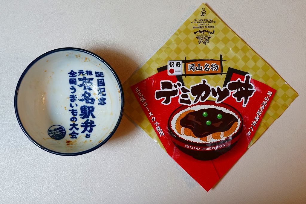 2020(令和2)年1月の京王百貨店の駅弁大会で実演販売。新発売の岡山駅弁「デミカツ丼」について、京王百貨店駅弁大会限定で、その名を記した特製どんぶりに入れて販売した。2019年の金沢駅「蟹のドリア」、2018年の水戸駅「常陸牛山椒風味カルビ弁当」、2017年の鳥取駅「山陰鳥取かにめし」、2016年の米子駅「海の宝箱丼」、2015年の名古屋駅「抹茶ひつまぶし日本一弁当」と同じ。売れ行きはイマイチだったようで、最初は併売された通常版を、この特製どんぶり版が売り切れてから売るようになった。