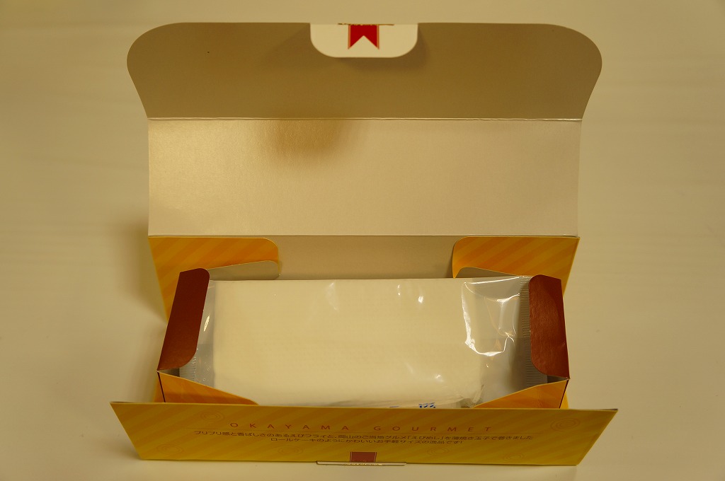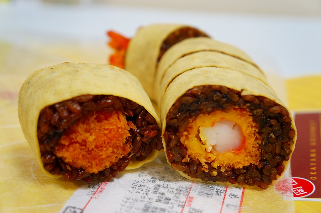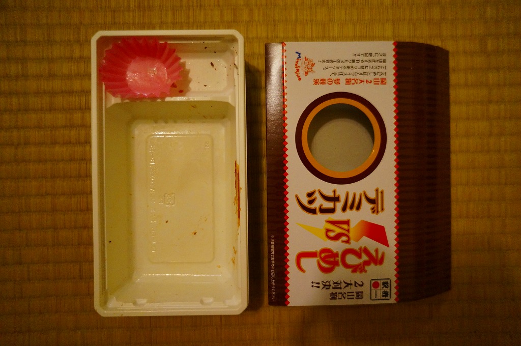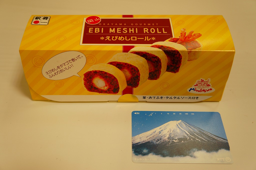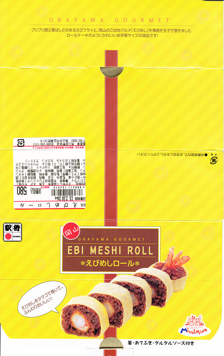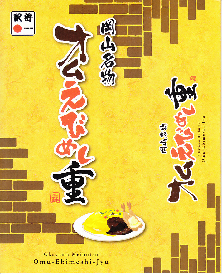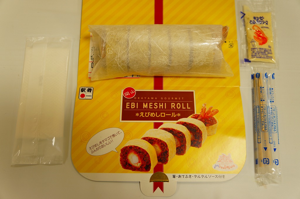 2011(平成23)年の発売か。エビフライをソース色の岡山名物えびめしで巻き、さらに薄焼き卵で巻いて、パッケージの写真のとおり5切れにカットして、タルタルソースや伸縮する箸を付けて、黄色い紙箱に収める。現地で買って食べてうまかったという話は聞かないが、ていねいに作られたB級グルメは駅弁催事では大好評で、よく売り切れている。価格は2013年の購入時で580円、2014年4月の消費税率改定で630円。2014年までの販売か。