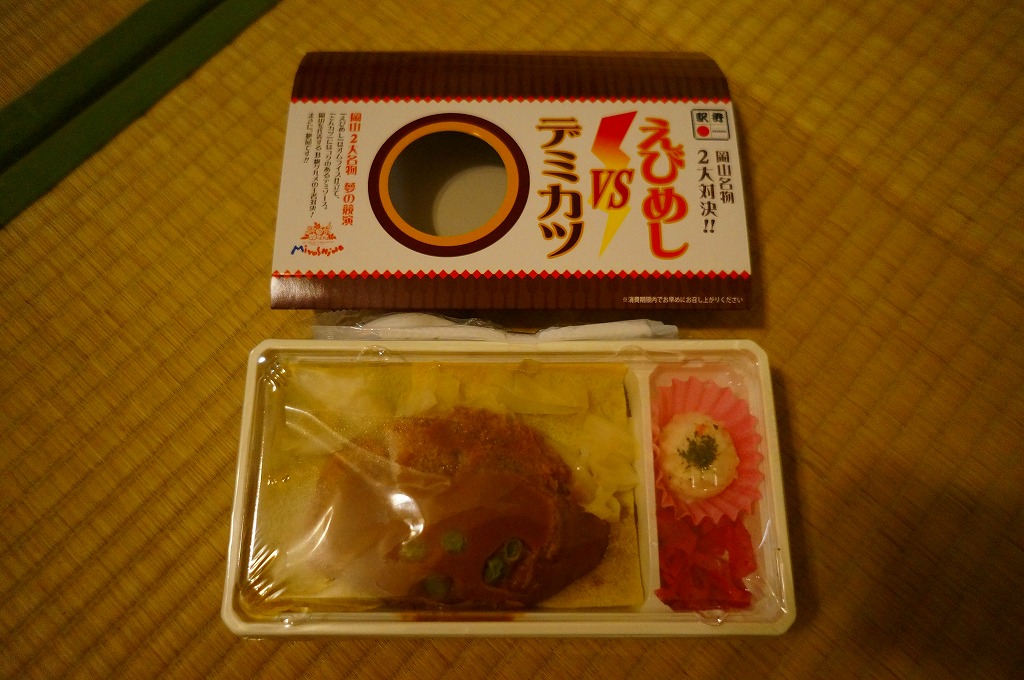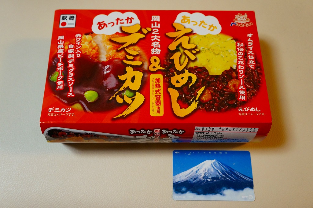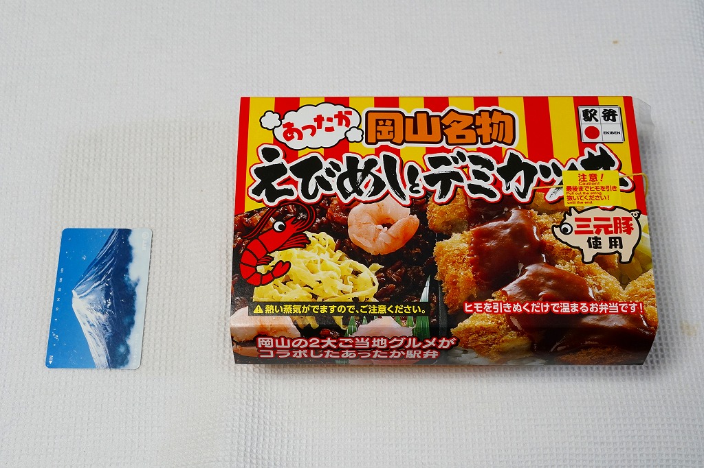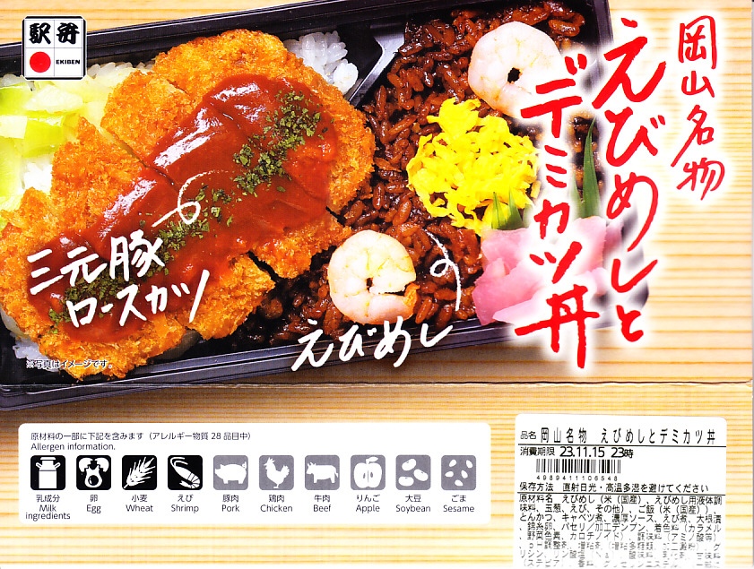 2011(平成23)年4月15日の発売。電子レンジ対応タイプな白いプラ製容器に透明なふたをして、商品名と宣伝文を書いたカツが見えるボール紙の枠にはめる。中身はパッケージの側面くらい濃いソース色でパラパラのえびめしの上を薄焼き玉子で覆い、デミグラスソースをべったり塗ったトンカツを載せ、ポテトサラダと大根漬を添えるもの。いずれも岡山の味、ということは岡山以外に広まらないのだろうが、レンジで温めるとよりB級グルメ感が増す感じ。駅弁としては安価なこともB級グルメ感あり。価格は2012年の購入時で780円、2014年4月の消費税率改定で800円。2016年2月に「岡山名物えびめしとデミカツ丼」へリニューアルし、2020年まで販売か。