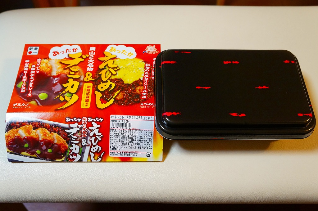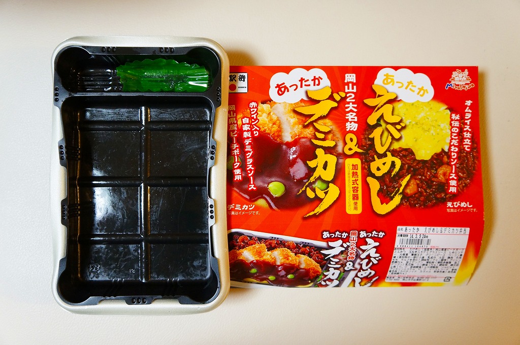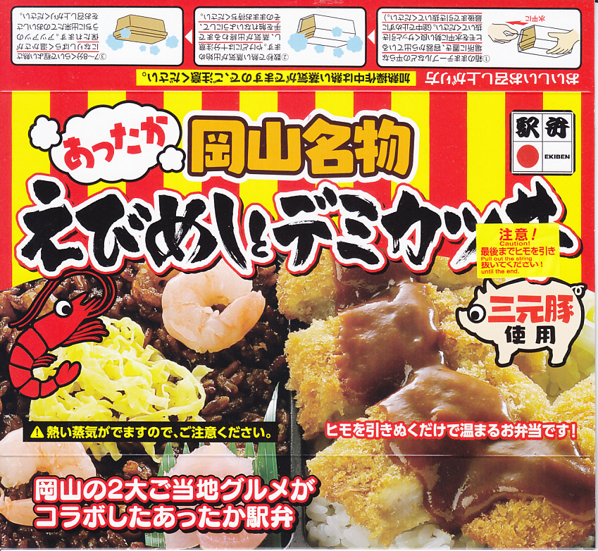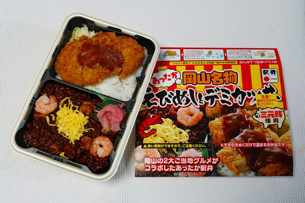 2016(平成28)年8月に下記の駅弁「あったかえびめし&あったかデミカツ」をリニューアル。四角い加熱機能付き容器の構造はそのままに、スリーブの絵柄をより派手に変え、中身は2区画に岡山名物とするえびめしとデミカツをそれぞれ詰めるものに変更した。真っ黒なエビ飯とB級なカツ飯は、引き続き上質なジャンクフードだと思う。