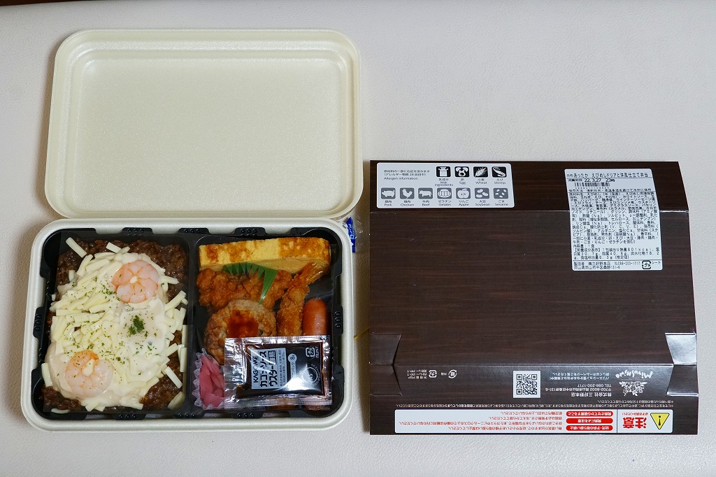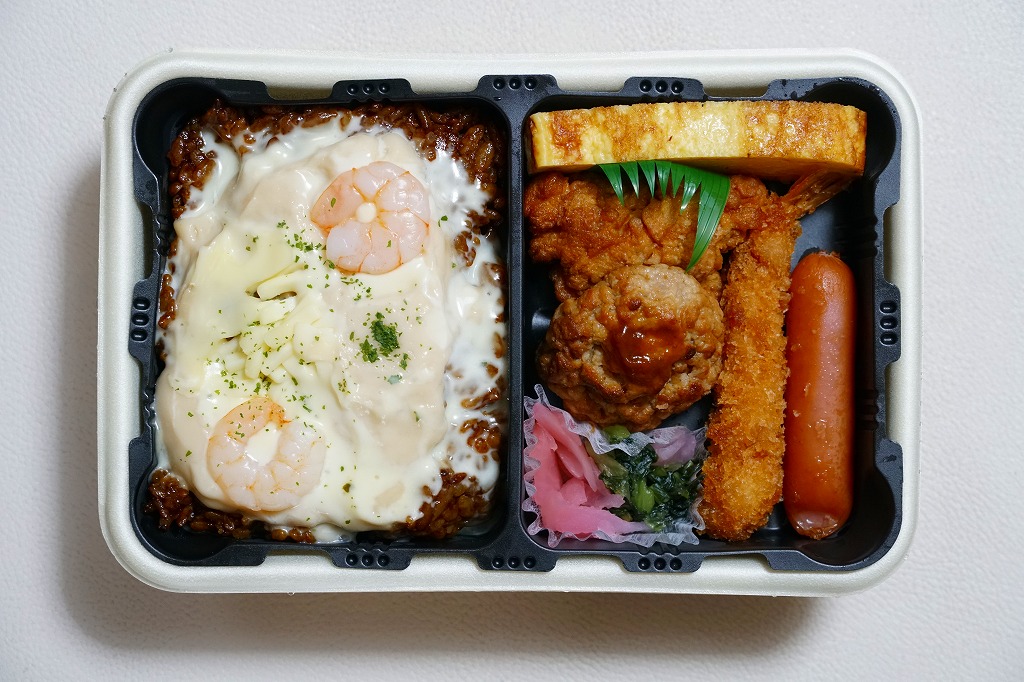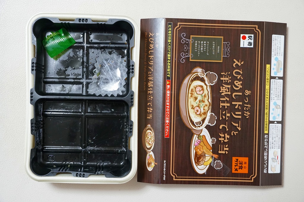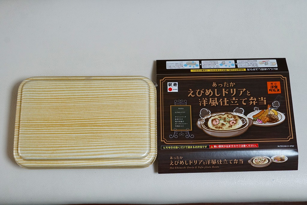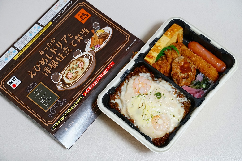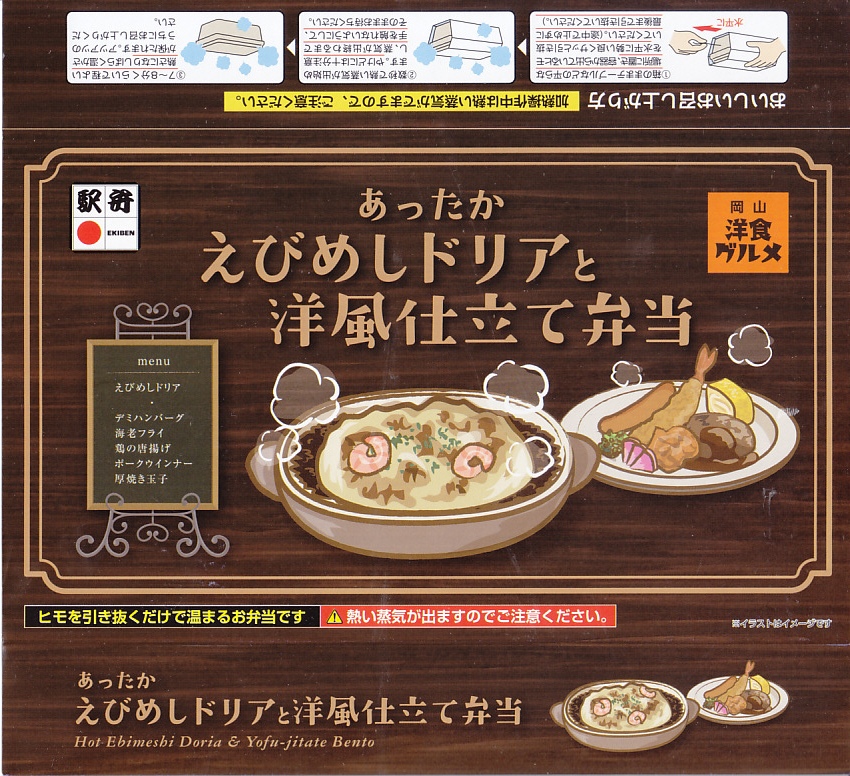 2021(令和3)年9月に発売。四角い加熱機能付き容器を収めたスリーブには、えびめしドリアとハンバーグなどを描く。中身は1区画でえびめしドリア、もう1区画でデミハンバーグ、海老フライ、鶏の唐揚げ、ポークウインナー、厚焼き玉子、大根漬と青菜漬。ソースで黒く染まる御飯をホワイトソースとチーズで覆い海老を添える岡山のえびめしと、洋食のおかずと、玉子焼に漬物という和風の3要素を詰め合わせた、個性的な不思議ちゃん。全体的な印象としては、商品名どおりの洋風の弁当だと思う。2022年までの販売か。