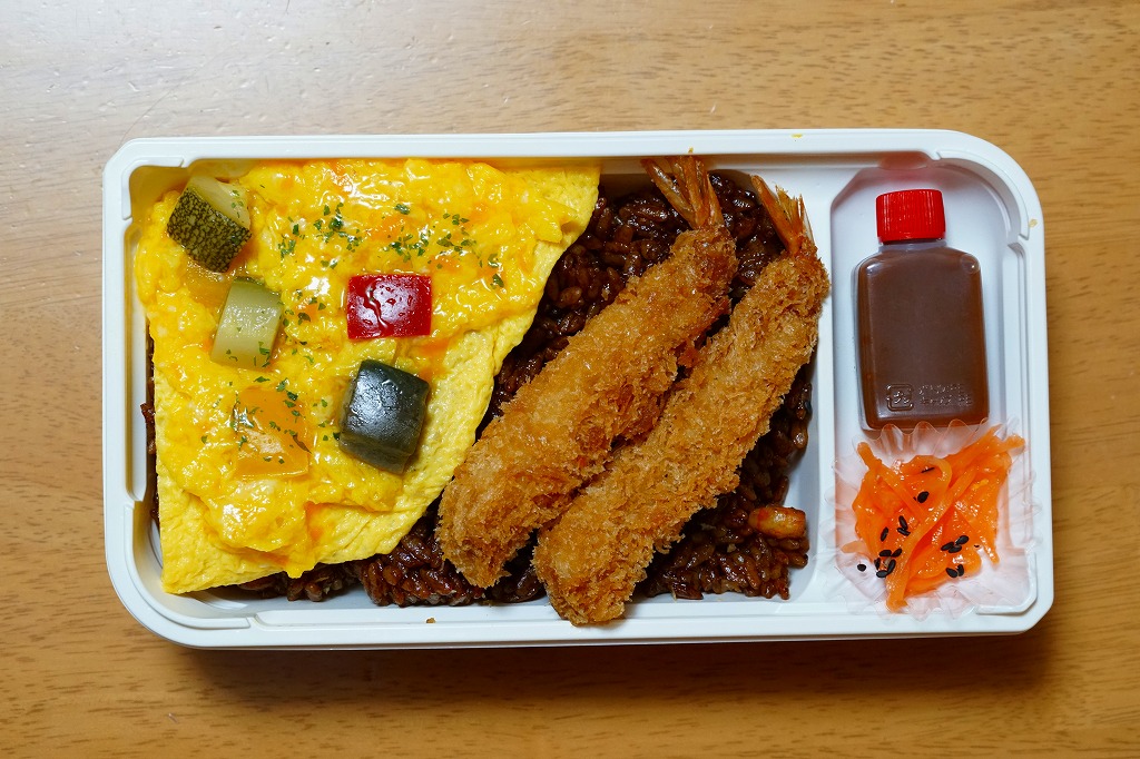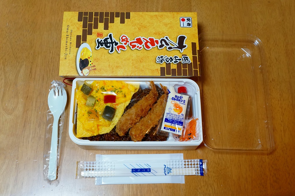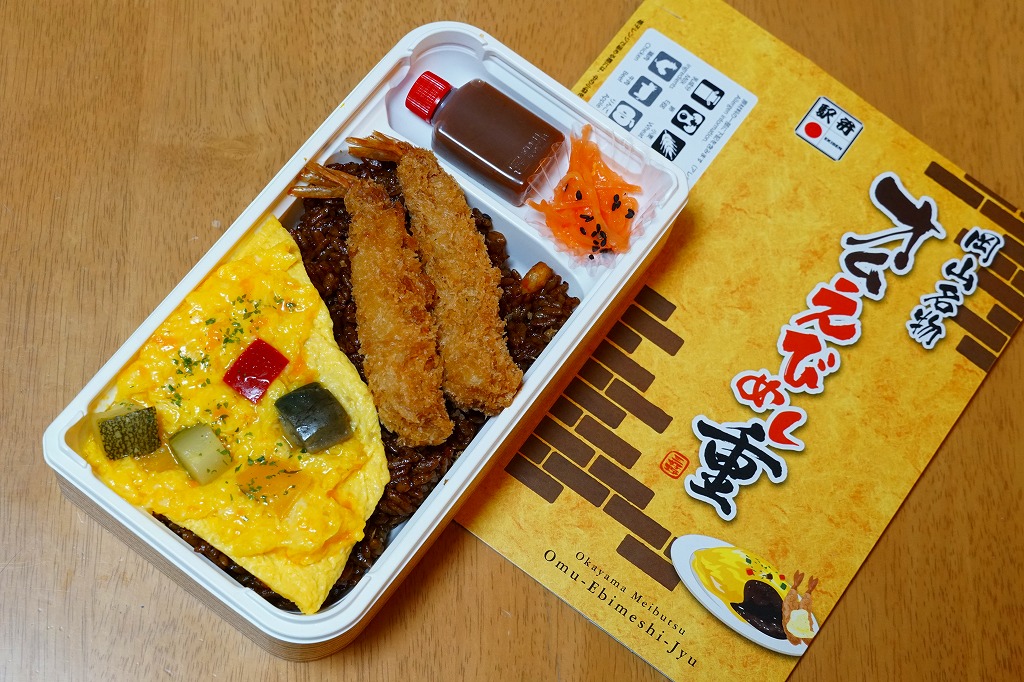 2020(令和2)年9月までに発売か。駅弁の名前のとおり、岡山のえびめしにオムレツを載せたもの。デミグラスソースで黒く染まるエビの混ぜ御飯に、パプリカやズッキーニなどを混ぜたオムレツを載せ、エビフライ2本も載せ、ニンジン炒めとソースを添える。岡山駅の駅弁で手を変え品を変え何度か食べた気がする、期待どおりの味。1年間ほどの販売か。
