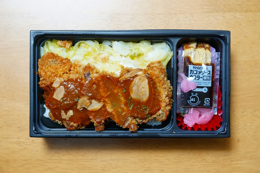 秋冬の駅弁大会シーズンに向けた、2020(令和2)年秋の新商品か。長い名前が中身を表現するとおり、白飯をサーロインのカツのデミグラスソースかけとキャベツのコンソメ煮で覆い、玉子焼とソースと大根漬と青菜漬を添える。デミグラスソースに味と実物でニンニクがたっぷり含まれるようで、ふたを開けてから食べ終わるまで強烈なニンニク臭が漂い続けたのも、またプレミアムか。2022年7月限りで終売。