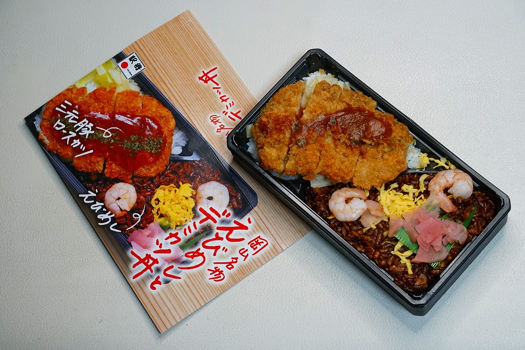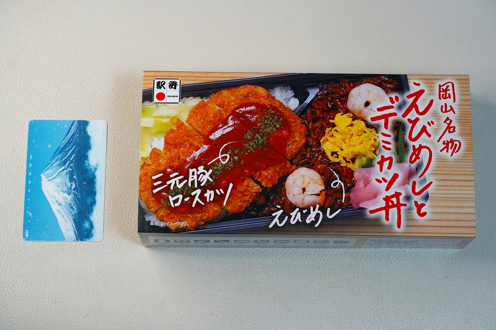 2023(令和5)年7月に岡山駅で発売か。「えびめしとデミカツ」という岡山駅弁は、下記のとおり2011年から数種類が出てきており、新商品という感じがしない。長方形のプラ容器の2区画に、黒いえびめしにエビと錦糸卵と大根桜漬を載せた「えびめし」と、白飯に濃厚ソースをかけた三元豚ロースカツとキャベツ煮を載せた「デミカツ丼」を収める。そんな内容は、2016年にリニューアルした加熱機能付き容器のものと、ほとんど同じ。味も変わらない。この間に駅弁の価格は1割から3割ほど上昇した感じなので、千円を切る価格での輸送販売はお徳に思えた。
