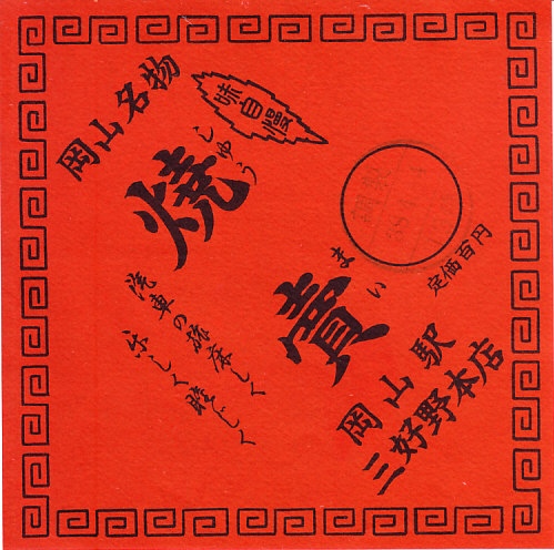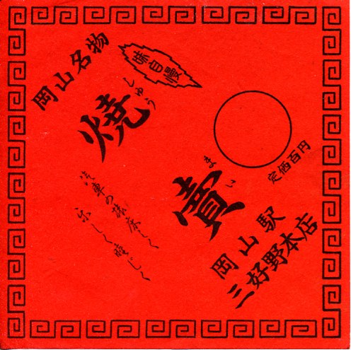 第二次大戦後の調製と思われる、昔の岡山駅弁の掛紙。焼売は昔も今も岡山の名物ではないと思うが、かつて横浜や鳥栖に限らず主要幹線の拠点駅に構える多くの駅弁屋で取り扱いがあり、今はそうではない焼売の掛紙そのものが、戦後昭和の懐かしさを演出するアイテムかもしれない。