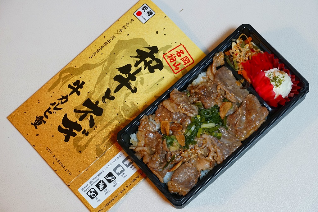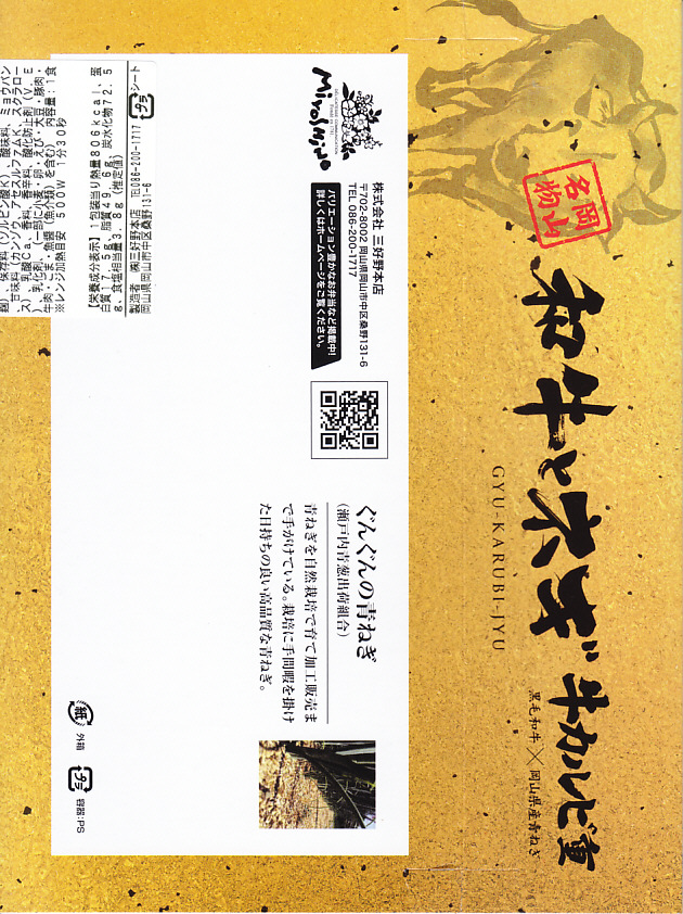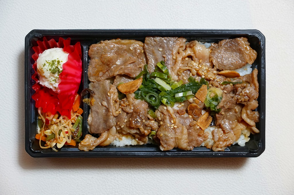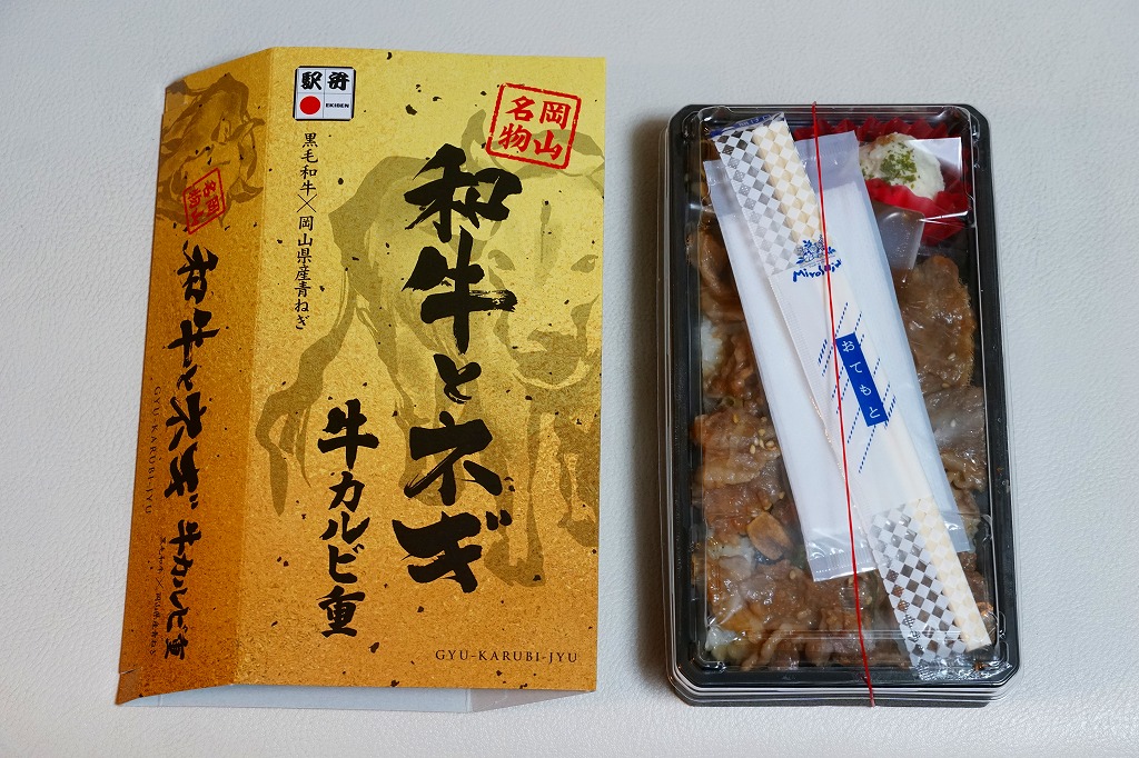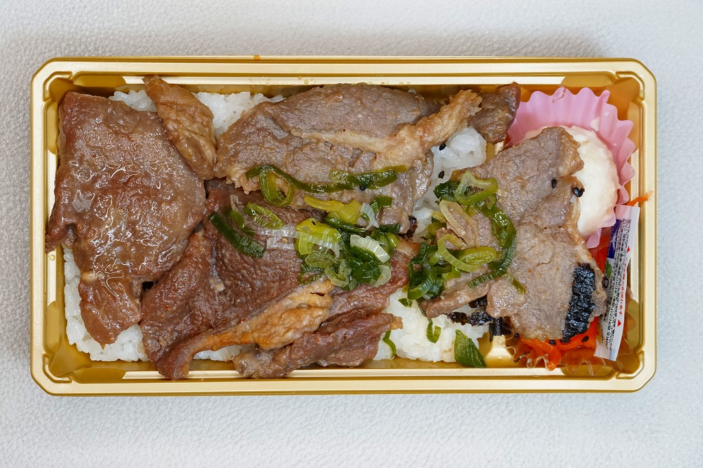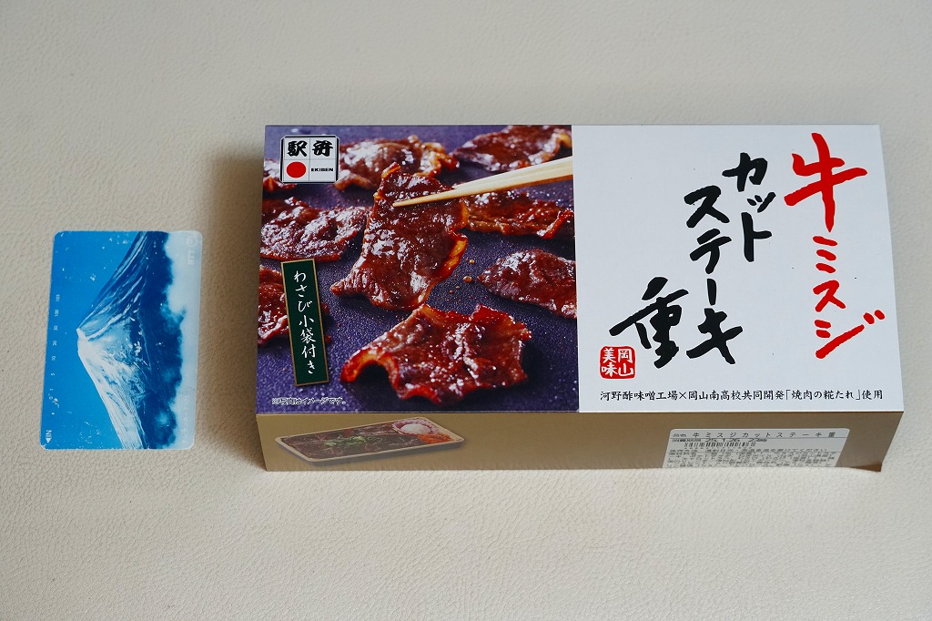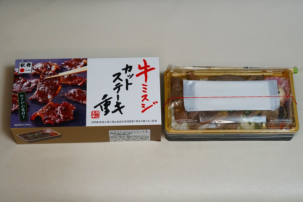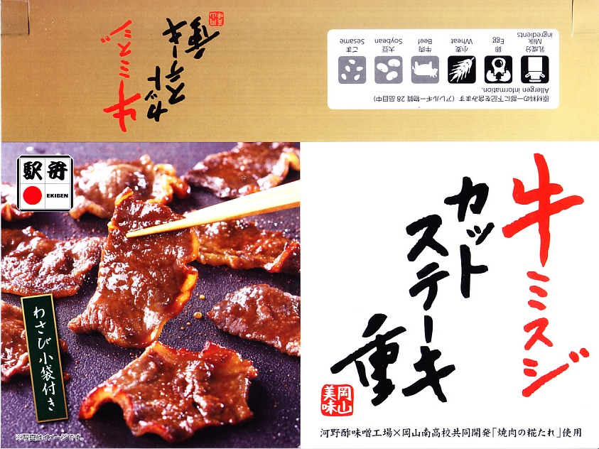2024(令和6)年7月までに岡山駅などで発売か。白飯を牛焼肉で覆い、ねぎボイルを載せ、ポテトサラダとキャロットラペを添え、わさび小袋を別添。現物でなく公式サイトで「牛ミスジ肉を糀入りのタレに漬込み、香ばしく焼き上げました。」と紹介する牛ミスジカットステーキは、岡山県真庭市の河野酢味噌工場と岡山南高等学校商業学科の生徒が共同開発し2018年4月から市販される「焼肉の糀たれ」をまとい、しかしここでは薄味でホルモンのような硬い肉に難儀した。